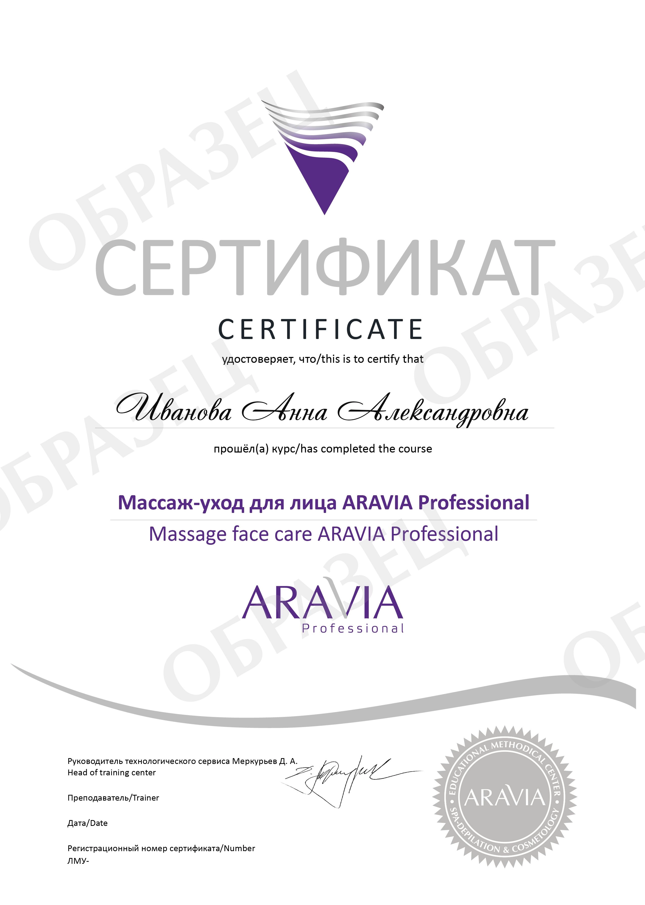 После прохождения курса участники получат методическое пособие косметолога ARAVIA Professional, пособие по массажу и именной сертификат о прохождении обучения по направлению «Массаж-уход для лица ARAVIA Professional».