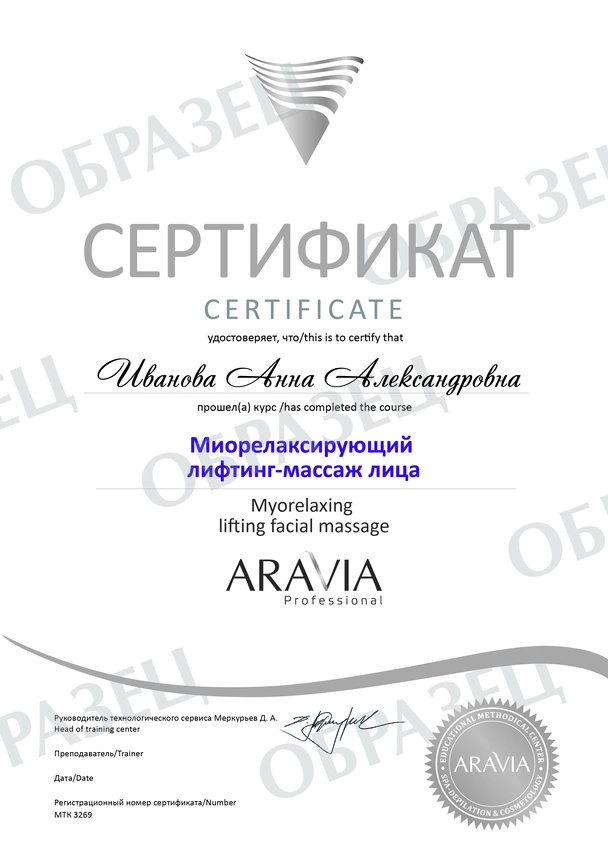 После прохождения курса участники получат методическое пособие косметолога ARAVIA Professional, пособие по массажу и именной сертификат о прохождении обучения по направлению «Миорелаксирующий лифтинг-массаж лица».