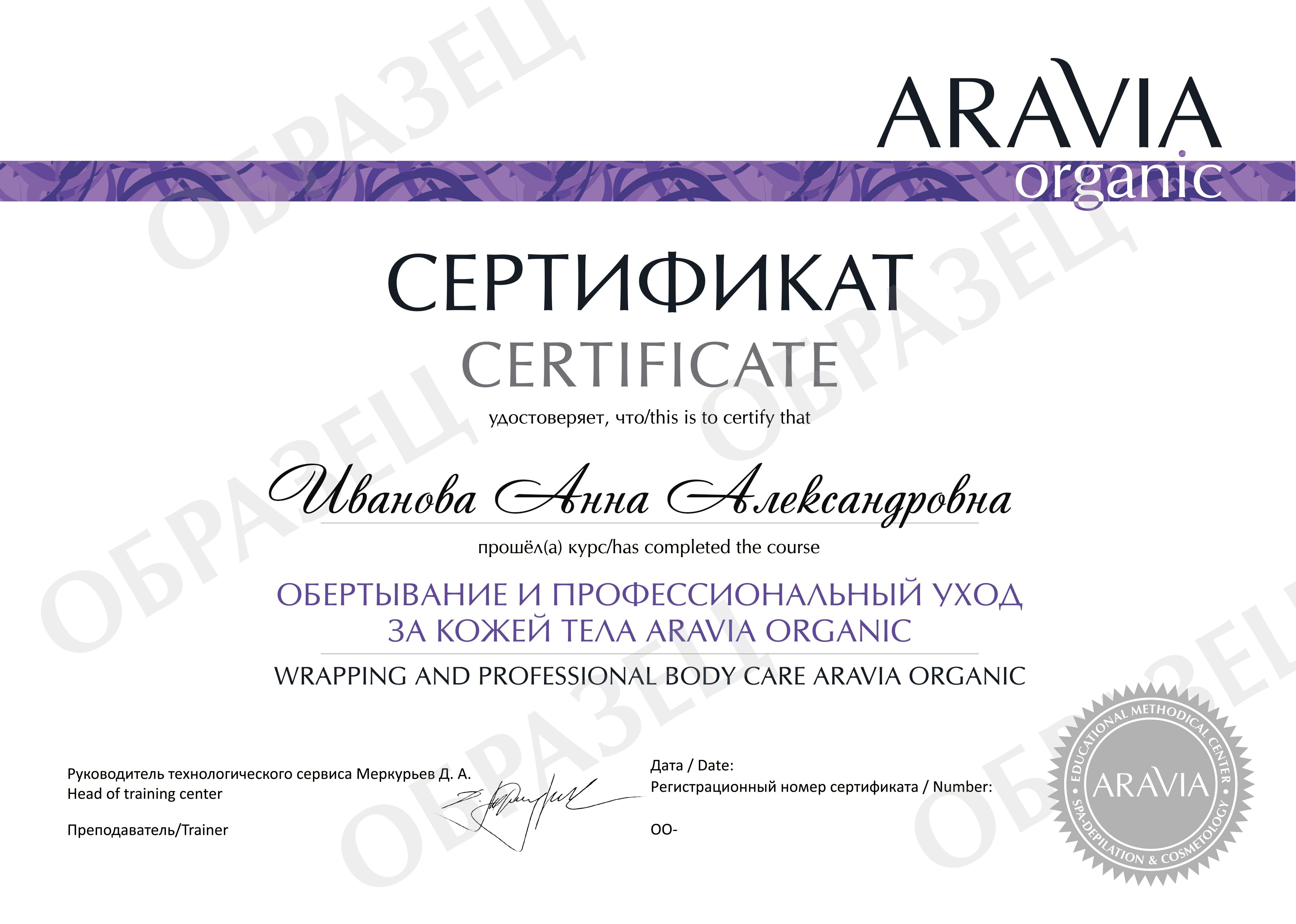 После прохождения курса участники получат методическое пособие, программы процедур и точные расчеты их себестоимости, каталоги, прайс-листы и именной сертификат о прохождении обучения по направлению «Обертывания, профессиональный уход за кожей тела ARAVIA Organic». Также косметолог получает постоянную скидку на ассортимент ARAVIA Organic до 40%.
