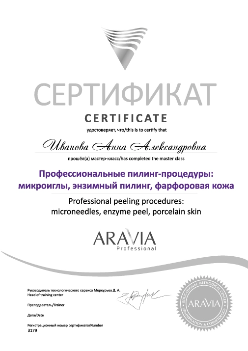 После прохождения мастер-класса участники получат прайс-листы по косметологии, методический материал и именной сертификат о прохождении мастер-класса по теме «Профессиональные пилинг-процедуры: микроигольчатый пилинг, энзимный пилинг, фарфоровая кожа».