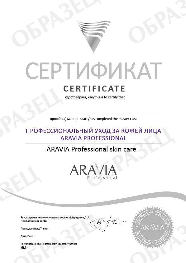 После прохождения мастер-класса участники получат прайс-листы, каталог продукции и именной сертификат о прохождении мастер-класса по теме «Профессиональный уход за кожей лица ARAVIA Professional».