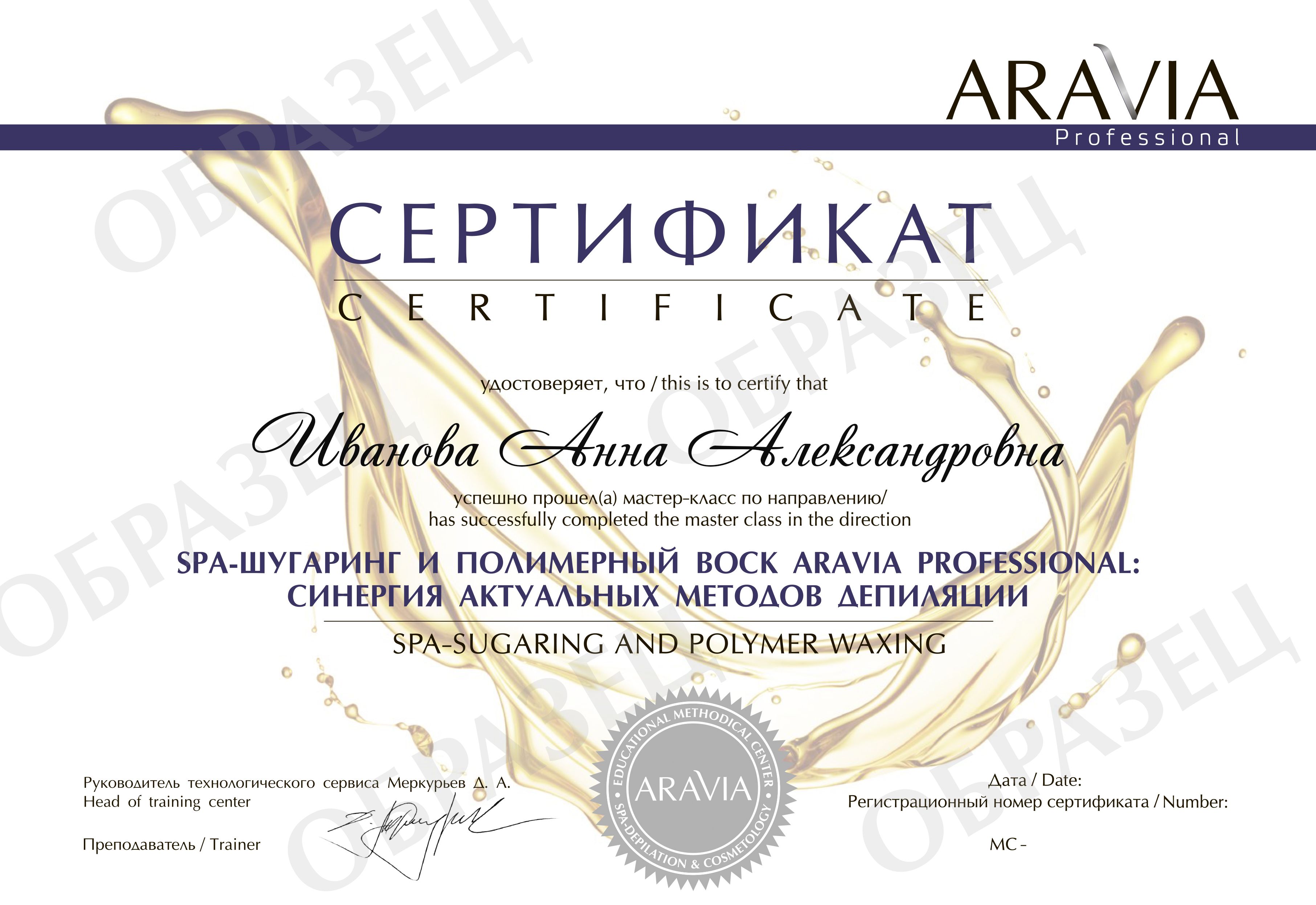 После прохождения мастер-класса участники получат прайс-лист и именной сертификат о прохождении мастер-класса по теме «SPA-шугаринг и полимерный воск ARAVIA Professional: синергия актуальных методов депиляции».