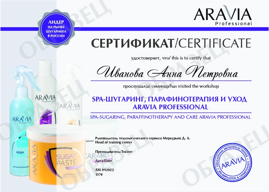 После прохождения мастер-класса участники получат каталоги, прайс-листы и именной сертификат о прохождении мастер-класса по теме «SPA-шугаринг, парафинотерапия и уход ARAVIA Professional».