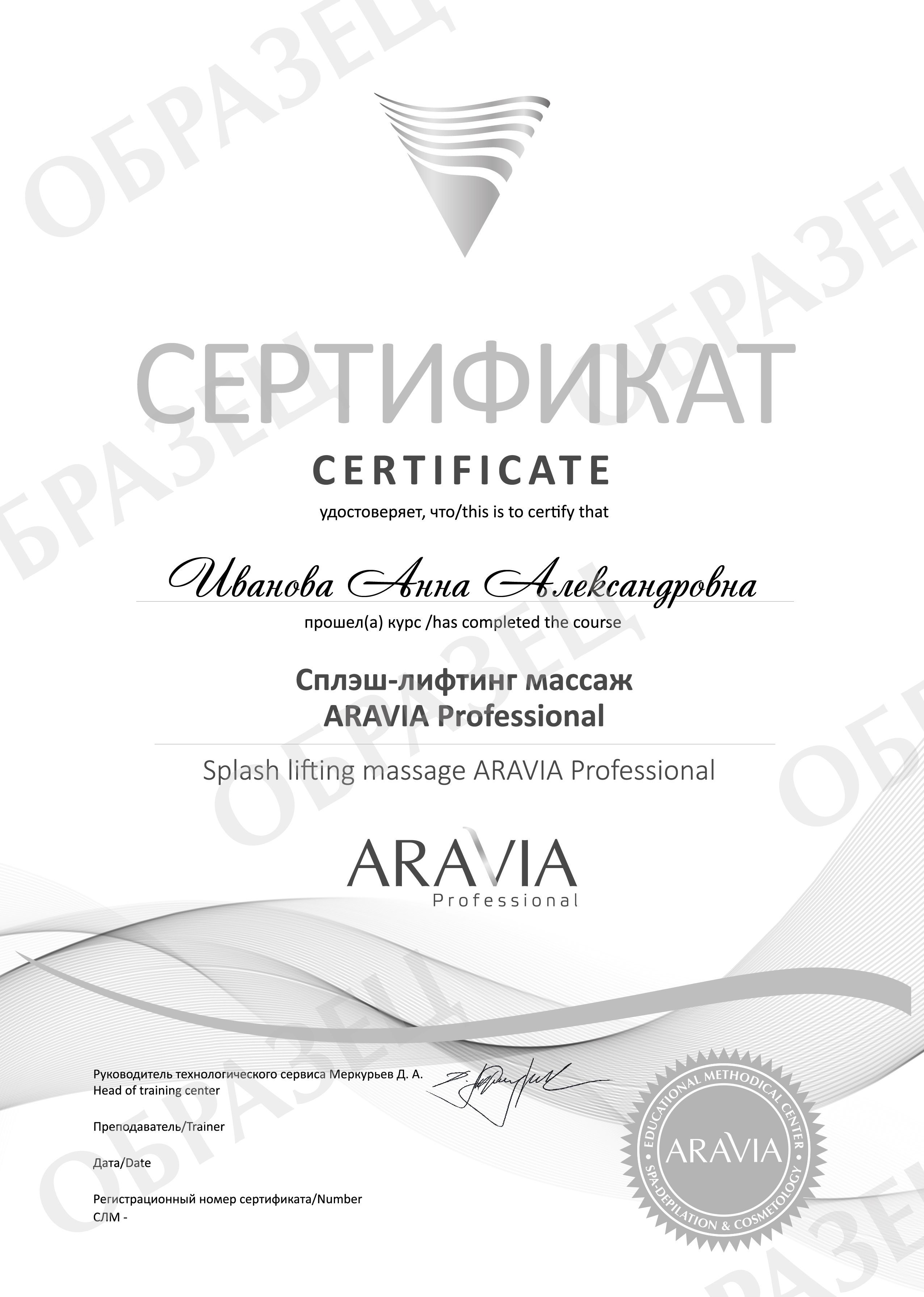 После прохождения курса участники получат методическое пособие косметолога ARAVIA Professional, пособие по массажу и именной сертификат о прохождении обучения по направлению «Сплэш-лифтинг массаж ARAVIA Professional».