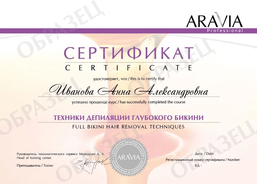 Пройдите три курса повышения уровня «Техники депиляции глубокого бикини», «Скоростные техники депиляции», «Ювелирные техники депиляции лица» и получите золотой сертификат «Эксперт spa-шугаринга».
