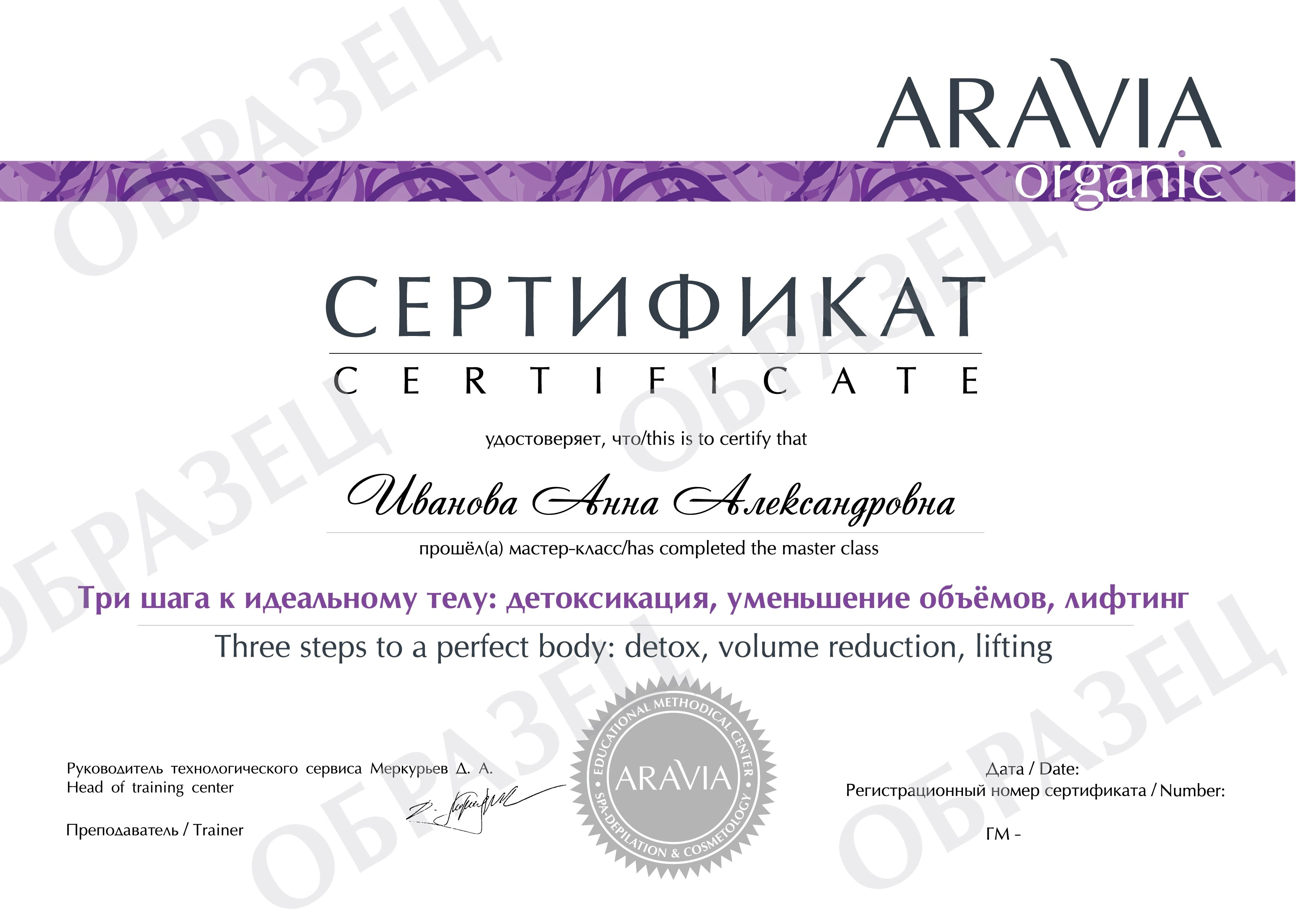 После прохождения мастер-класса участники получат информационный пакет: каталог «ARAVIA Organic», брошюру и именной сертификат о прохождении мастер-класса по теме «Три шага к идеальному телу: детоксикация, уменьшение объёмов, лифтинг».