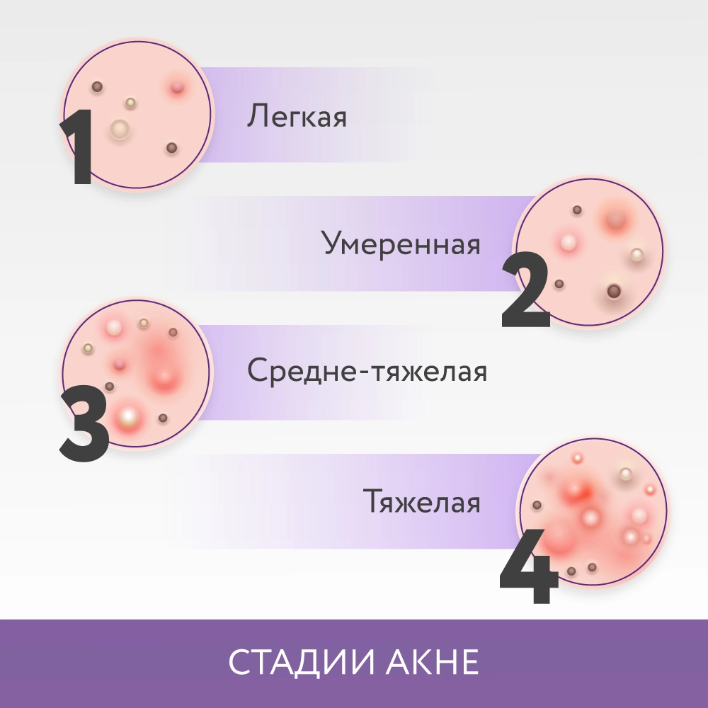 Условно выделяют четыре степени развития акне: легкая, средняя, умеренная и тяжелая.