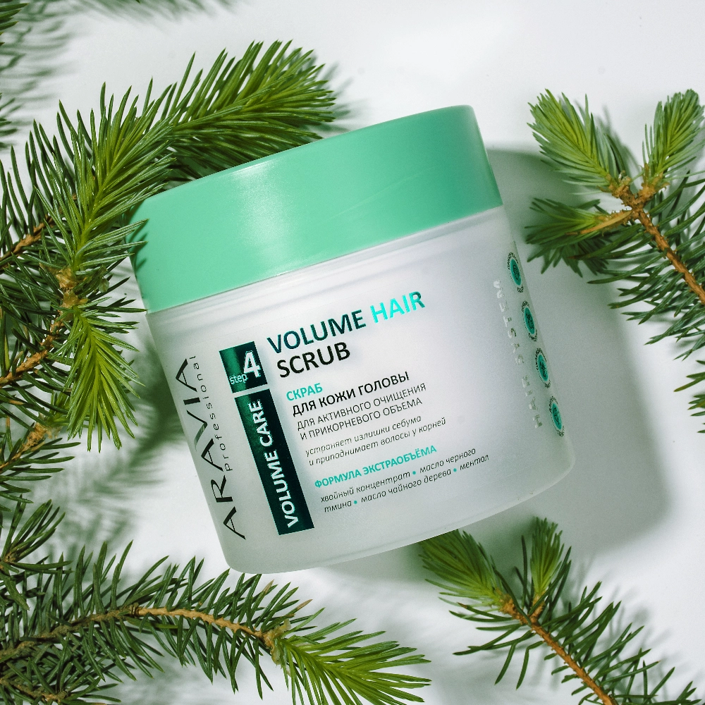 Для склонной к жирности кожи и тусклых волос оптимален Volume Hair Scrub — скраб для активного очищения и прикорневого объема. Состав глубоко очищает кожу головы, удаляя ороговевшие клетки, себум и остатки стайлинга. После применения кожа «дышит», а волосы становятся легкими и упругими у корней. Комбинация хвойного концентрата, масла черного тмина, масла чайного дерева и ментола работает в синергии: тонизирует кожу, нормализует секрецию сальных желез, освежает и защищает от внешних факторов. Хвойный концентрат укрепляет волосяные луковицы, масло черного тмина увлажняет и предотвращает шелушение, а ментол стимулирует микроциркуляцию, усиливая эффект массажа. Результат — ощущение чистоты, прохлады и визуально больший объем у корней.