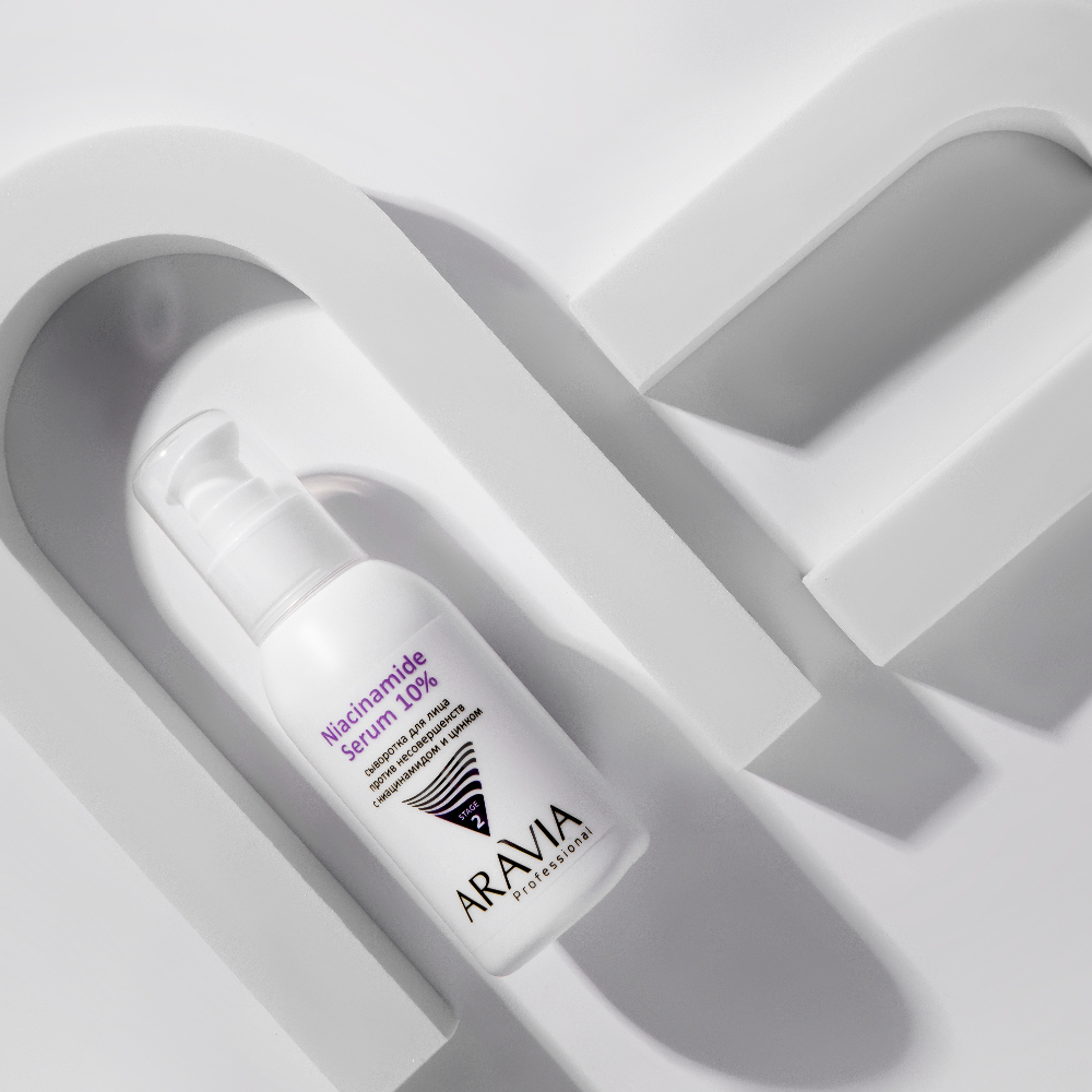 Противовоспалительное и успокаивающее действие. Под ниацинамидом кожа становится менее склонной к раздражениям и покраснениям. Например, сыворотка для лица против несовершенств с ниацинамидом и цинком Niacinamide Serum 10% снижает воспаления и выравнивает текстуру кожи. Сочетание ниацинамида и цинка регулирует салоотделение, а экстракты алоэ и брокколи мягко успокаивают.