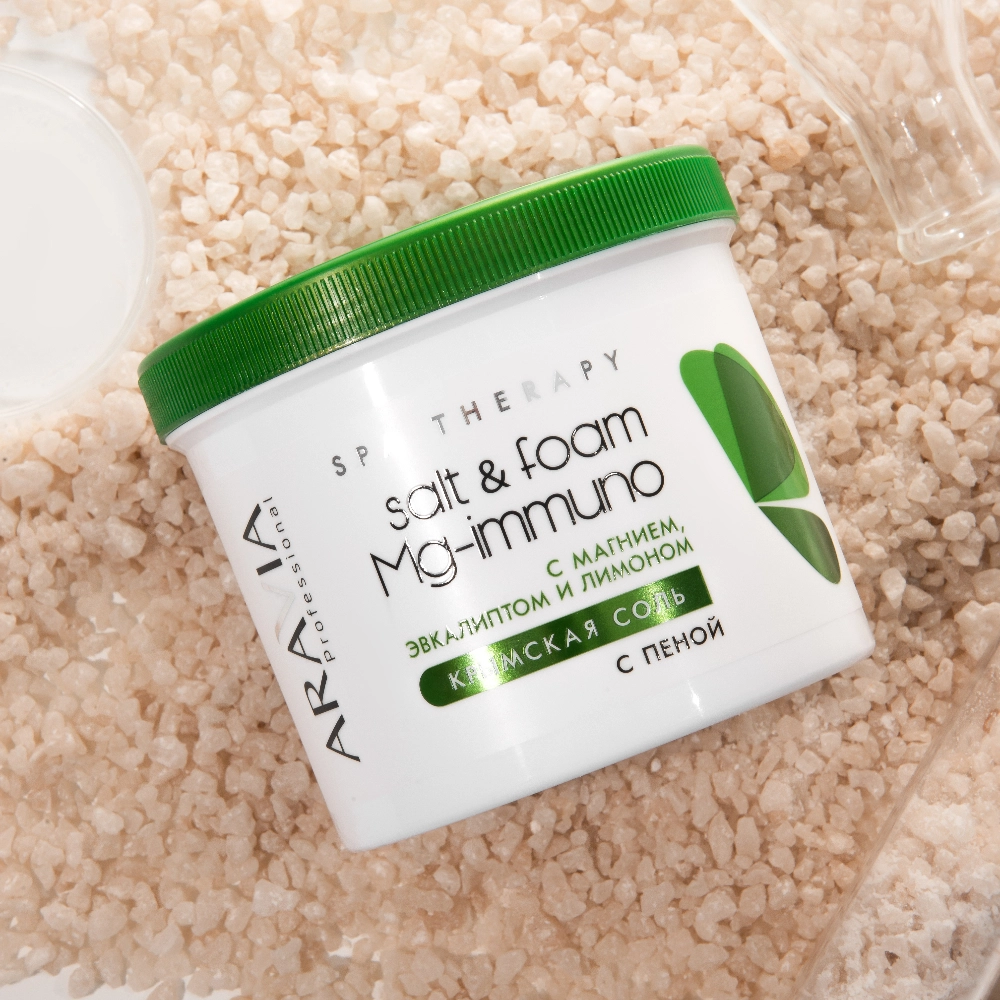 Особое внимание уделяется ногам. Крымская соль с пеной Salt&foam Mg-immuno с магнием, эвкалиптом и лимоном помогает снять усталость, расслабить стопы и улучшить микроциркуляцию, создавая ощущение легкости и комфорта.
