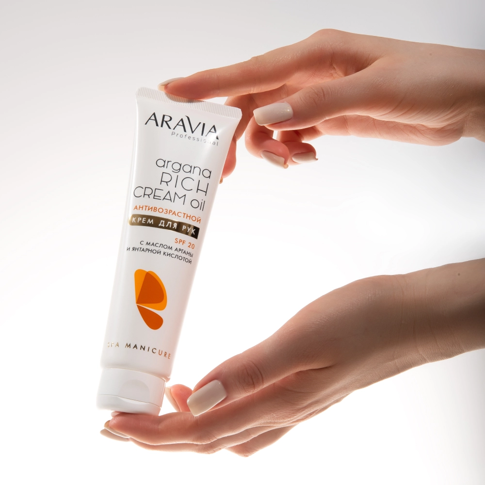 При использовании солнцезащитных средств в городе зачастую забывают о защите кожи рук, а она также подвержена воздействию ультрафиолета. Антивозрастной крем для рук SPF 20 станет эффективным дополнением в ежедневном уходе. Его бархатистая текстура смягчает кожу, напитывает ее полезными веществами и придает тонкий восточный аромат. Биоактивный состав крема включает масла ши, арганы, зародышей пшеницы и сладкого миндаля, которые глубоко питают, восстанавливают и защищают кожу рук от агрессивных внешних факторов. Экстракт боярышника оказывает антиоксидантное и противовоспалительное действие, способствуя восстановлению после УФ-излучения. Мочевина и пантенол обеспечивают интенсивное увлажнение и мягкое обновление, а витамин E и янтарная кислота укрепляют барьерные функции и придают коже ухоженный, свежий вид.