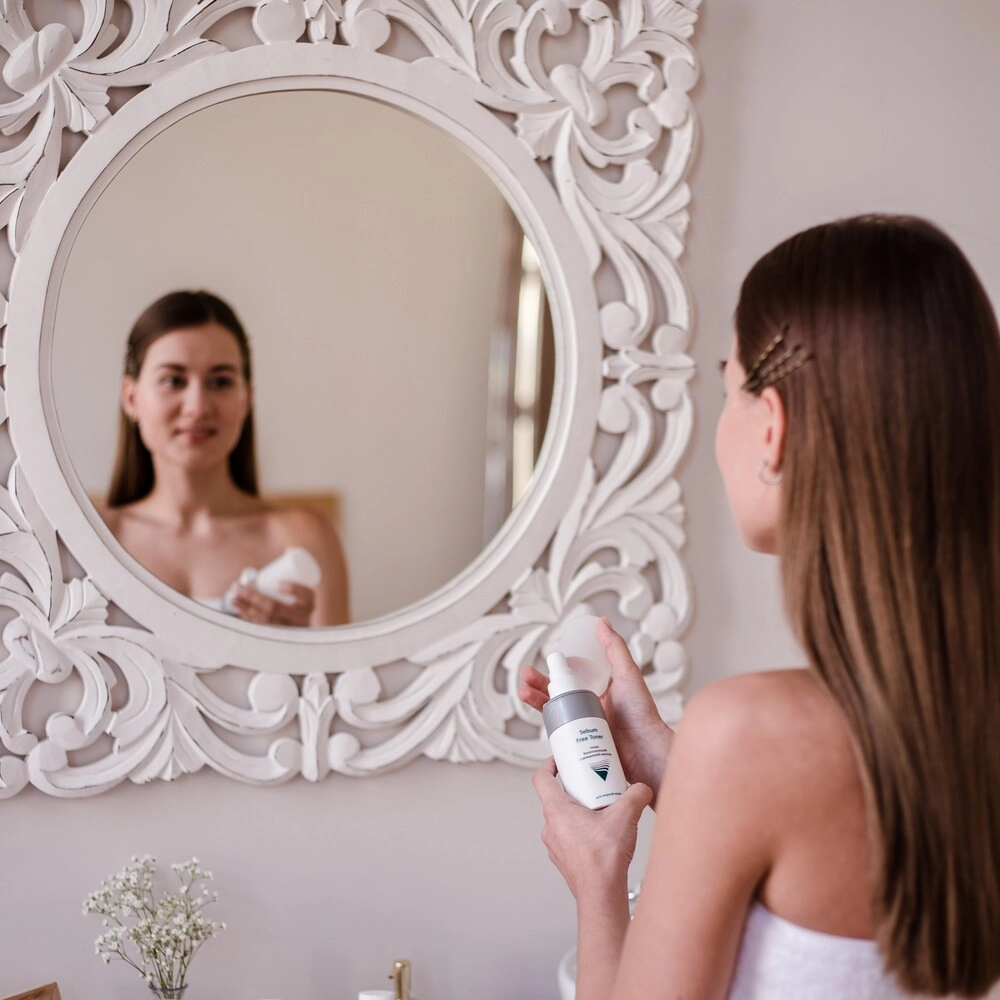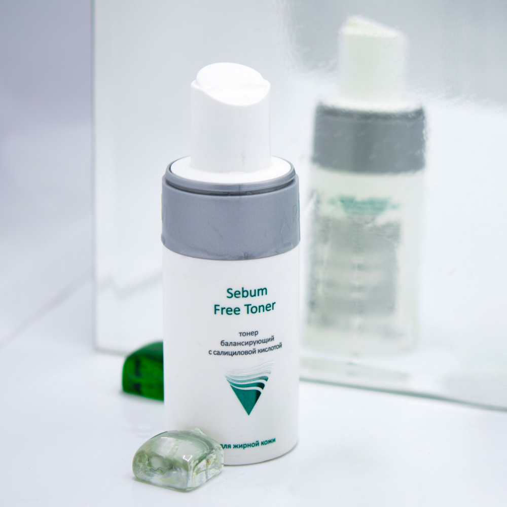 Тонер балансирующий с салициловой кислотой для лица Sebum Free Toner используется для ежедневного тонизирования жирной и комбинированной кожи. Гидролаты растений (розмарина, череды, чистотела, шалфея, подорожника) в его составе оказывают успокаивающее и увлажняющее действие. Салициловая кислота способствует отшелушиванию омертвевших клеток, ускоряет выравнивание и обновление кожи. Средство улучшает микроциркуляцию, сокращает выделение себума, нормализует работу сальных желез, минимизирует следы постакне. Быстро и надолго освежает и матирует кожу.