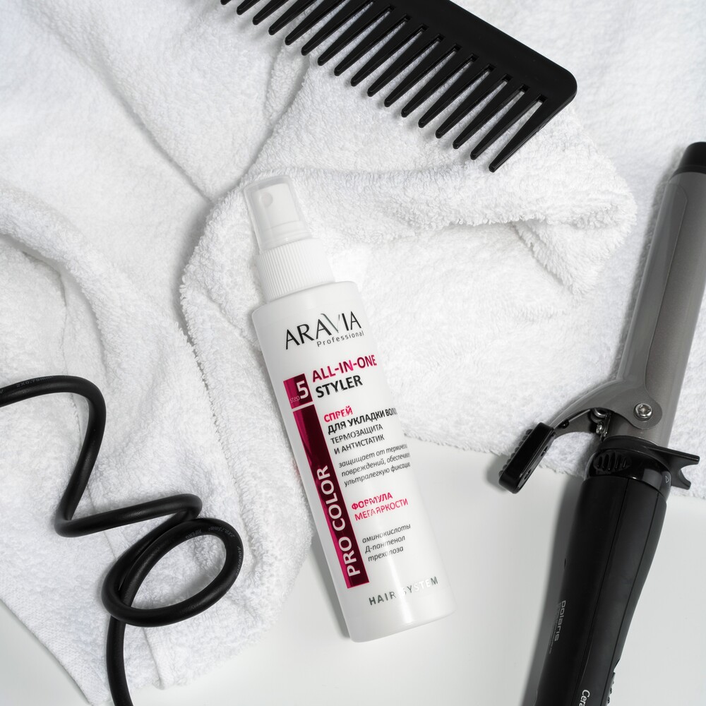 Обратите внимание на многофункциональный спрей All-In-One Styler. Он сочетает в себе термозащиту и антистатическое действие. Спрей равномерно распределяет тепло от стайлинговых приборов, предотвращает перегрев прядей, разрушение кератина и иссушение кутикулы. Антистатическое действие позволяет контролировать пушистость прядей даже в условиях очень высокой влажности, избавляет от статического электричества при слишком сухом воздухе. Дополнительный бонус спрея — обладает легким стайлинговым эффектом, позволяя зафиксировать укладку.