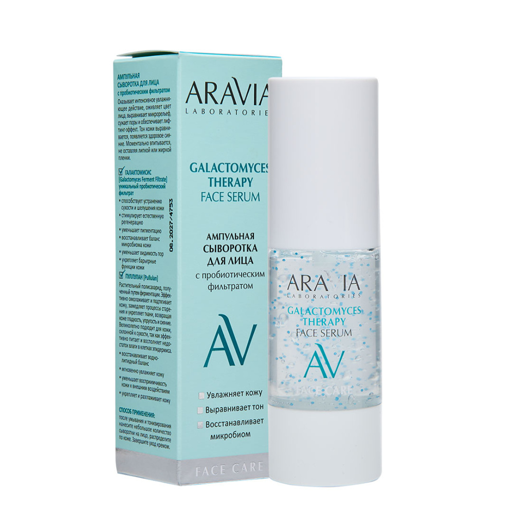 - Галактомисис — уникальный пробиотический фильтрат. Способствует устранению сухости и шелушения кожи, стимулирует естественную регенерацию, уменьшает пигментацию, восстанавливает баланс микробиома кожи, уменьшает видимость пор и укрепляет барьерные функции кожи.