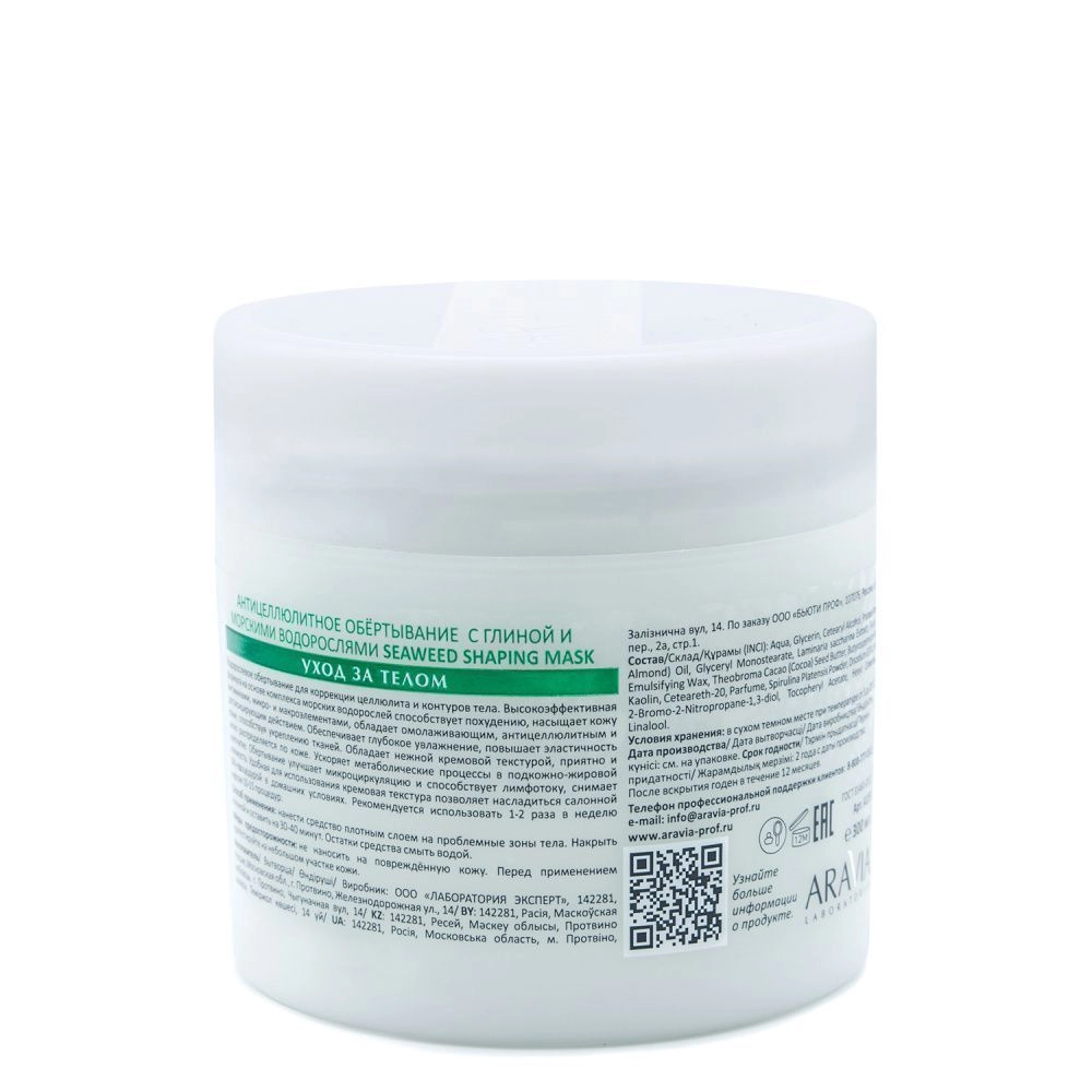 Водорослевое обертывание для коррекции целлюлита и контуров тела. Высокоэффективная формула на основе комплекса морских водорослей способствует похудению, насыщает кожу витаминами, микро- и макроэлементами, обладает омолаживающим, антицеллюлитным и детоксицирующим действием. Обеспечивает глубокое увлажнение, повышает эластичность кожи, способствуя укреплению тканей. Обладает нежной кремовой текстурой, приятно и легко распределяется по коже. Ускоряет метаболические процессы в подкожно-жировой клетчатке. Обертывание улучшает микроциркуляцию и способствует лимфотоку, снимает отечность. Удобная для использования кремовая текстура позволяет насладиться салонной СПА-процедурой в домашних условиях.