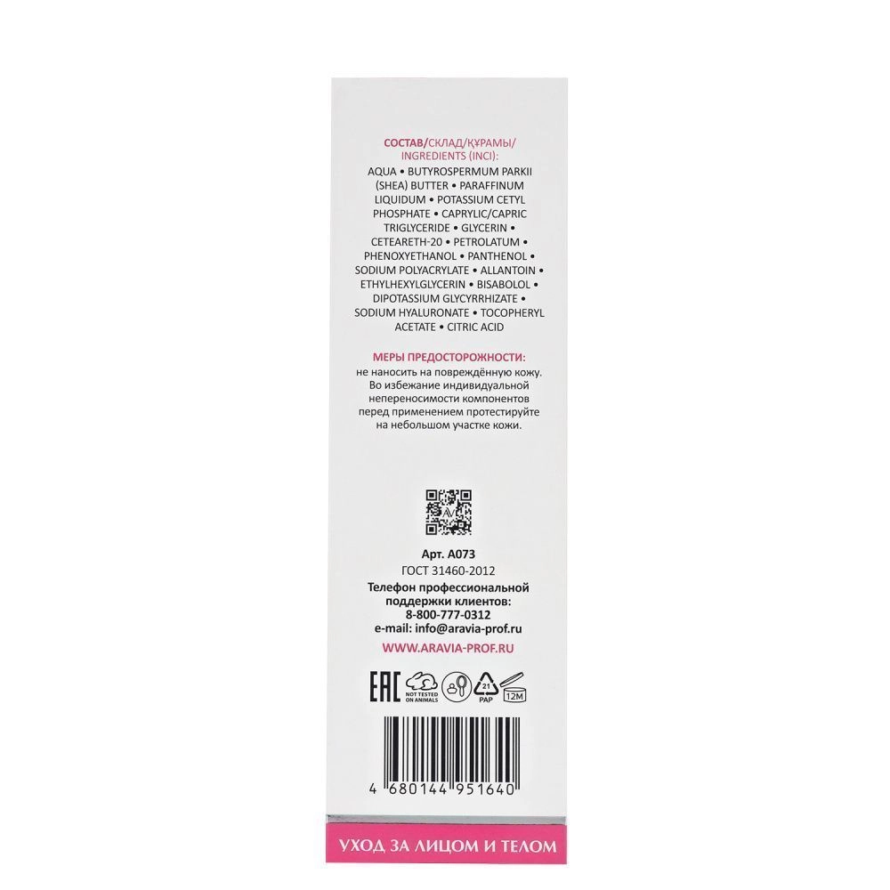 Меры предосторожности: не наносить на повреждённую кожу. Во избежание индивидуальной непереносимости компонентов перед применением тестировать на маленьком участке кожи. Продукт сертифицирован. Не тестируется на животных.