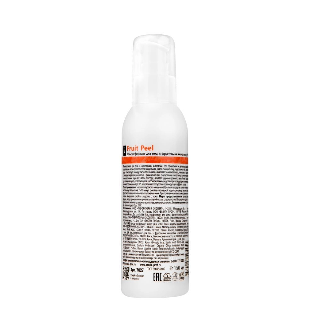 Гель-эксфолиант для тела с фруктовыми кислотами 10% эффективно и деликатно отшелушивает омертвевшие клетки рогового слоя эпидермиса, мягко очищает кожу, подготавливая её к дальнейшему уходу. Способствует выводу токсинов и шлаков, обновляет и освежает кожу, повышает её эластичность, стимулирует выработку коллагена. Применение геля с фруктовыми кислотами устраняет неровности на поверхности кожи, улучшает цвет и текстуру, придает здоровый ровный оттенок. Служит проводником для активных веществ, содержащихся в косметических средствах при последующем интенсивном уходе за кожей. Оптимальный рН 3,5 обеспечивает отсутствие травмирующего эффекта на кожу.