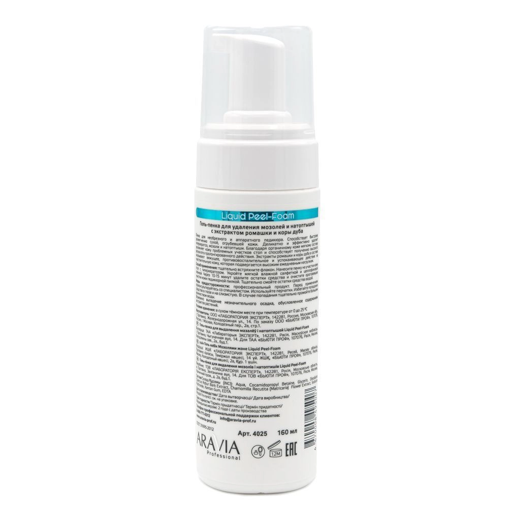 Пенка для необрезного и аппаратного педикюра. Способствует быстрому размягчению сухой, огрубевшей кожи. Деликатно и эффективно удаляет гиперкератоз, мозоли и натоптыши. Благодаря органичному коже мягкому составу увлажняет кожу проблемных участков стоп и способствует получению высокого результата пролонгированного действия. Экстракты ромашки и коры дуба в составе оказывают вяжущее и успокаивающее действие на чувствительную кожу, которая подвергается высоким ежедневным нагрузкам.