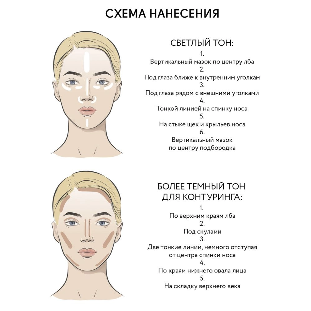Нанести на необходимые зоны увлажненной кожи лица и растушевать подушечками пальцев, спонжем или кистью. Для усиления эффекта нанести несколько слоев.