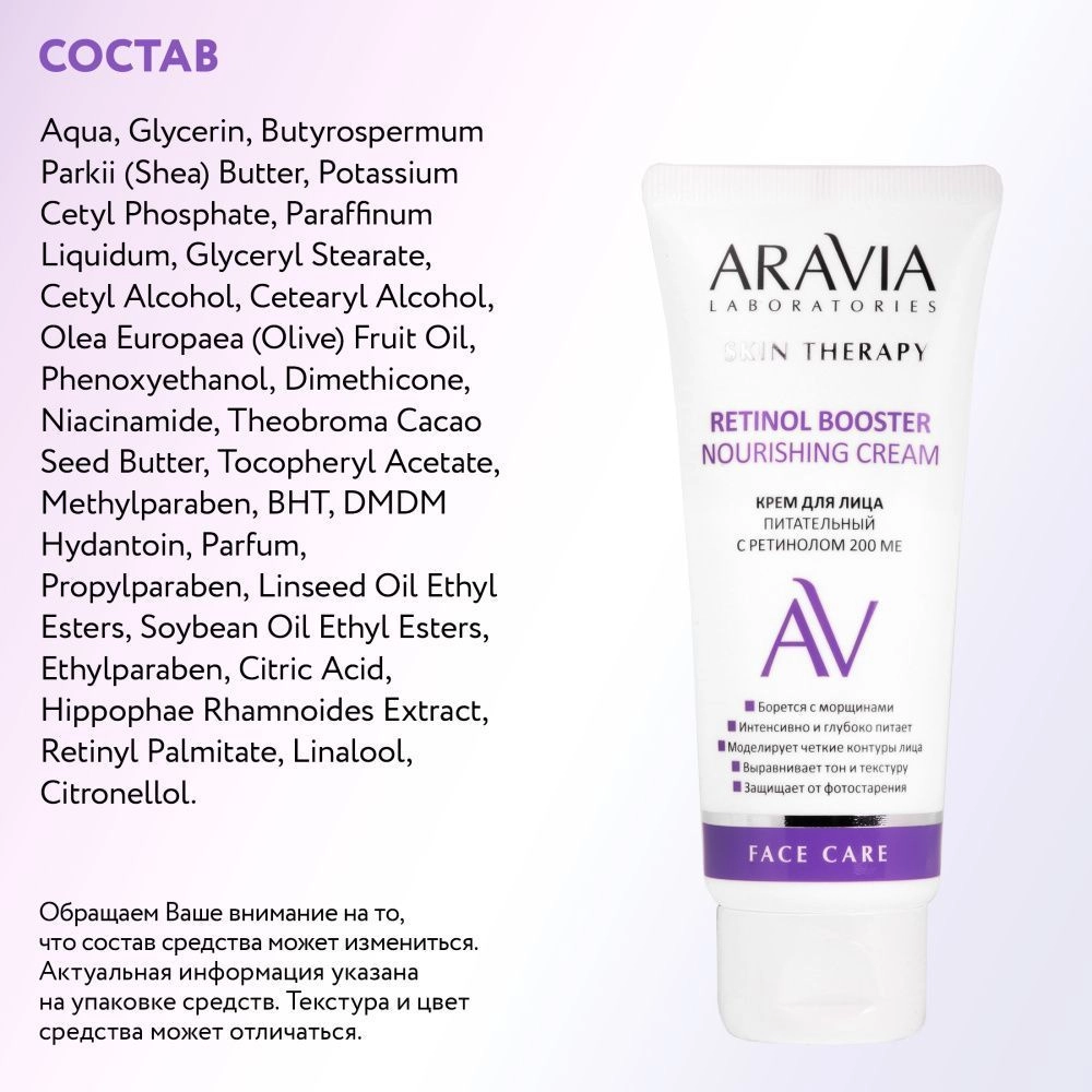 Состав продукта (INCI): Aqua, Glycerin, Butyrospermum Parkii (Shea) Butter, Potassium Cetyl Phosphate, Paraffinum Liquidum, Glyceryl Stearate, Cetyl Alcohol, Cetearyl Alcohol, Olea Europaea (Olive) Fruit Oil, Phenoxyethanol, Dimethicone, Niacinamide, Theobroma Cacao Seed Butter, Tocopheryl Acetate, Methylparaben, BHT, DMDM Hydantoin, Parfum, Propylparaben, Linseed Oil Ethyl Esters, Soybean Oil Ethyl Esters, Ethylparaben, Citric Acid, Hippophae Rhamnoides Extract, Retinyl Palmitate, Linalool, Citronellol.