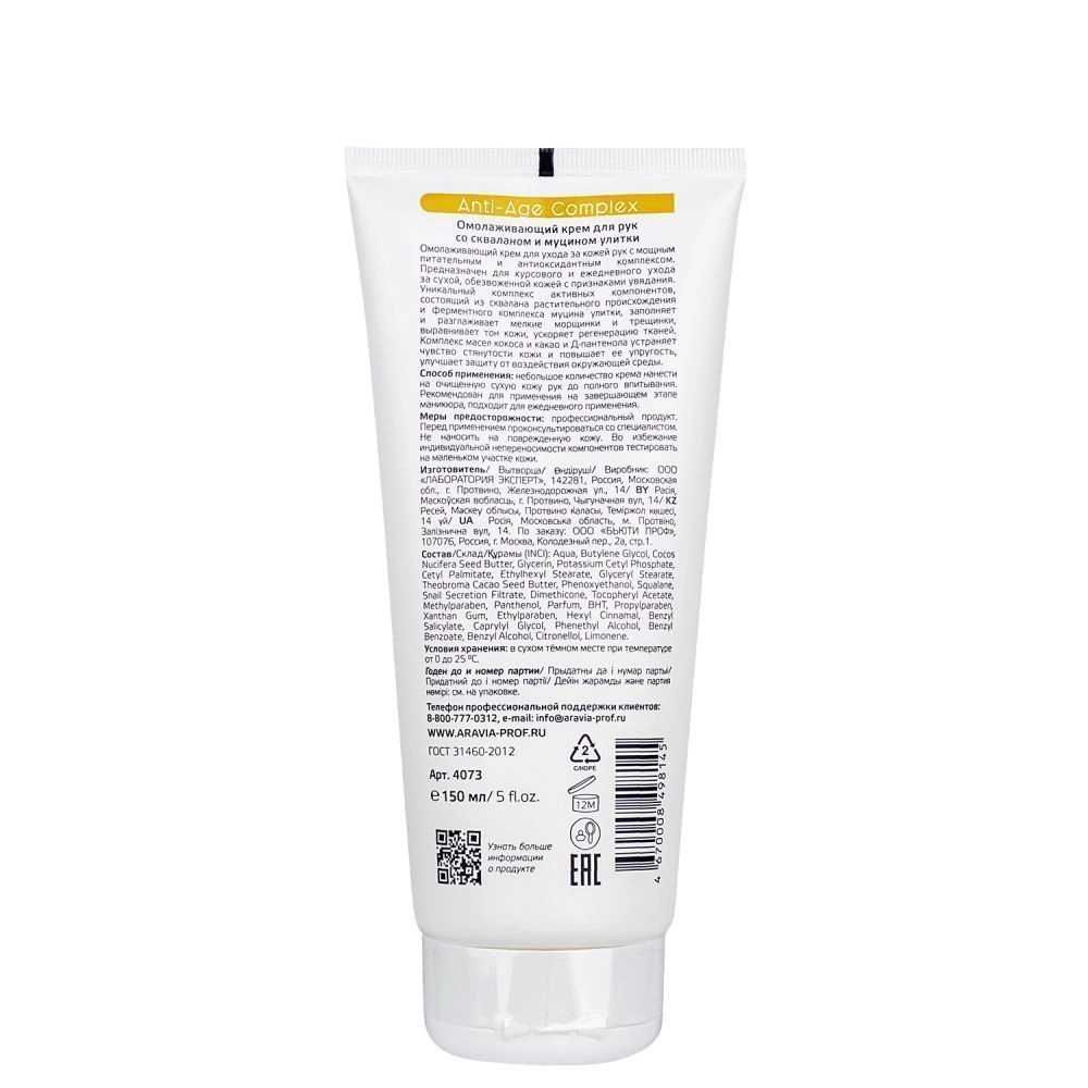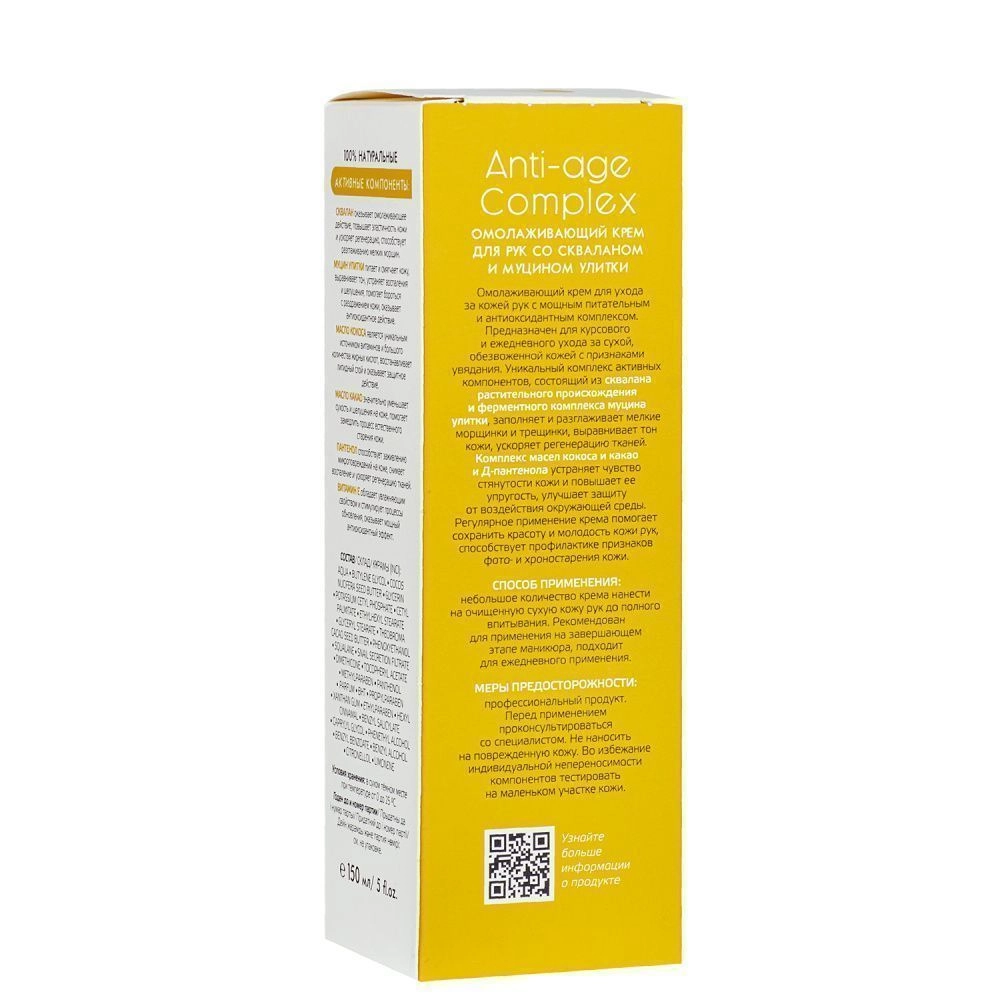 Омолаживающий крем для ухода за кожей рук с мощным питательным и антиоксидантным комплексом. Предназначен для курсового и ежедневного ухода за сухой, обезвоженной кожей с признаками увядания. Уникальный комплекс активных компонентов, состоящий из сквалана растительного происхождения и ферментного комплекса муцина улитки, заполняет и разглаживает мелкие морщинки и трещинки, выравнивает тон кожи, ускоряет регенерацию тканей. Комплекс масел кокоса и какао и Д-пантенола, устраняет чувство стянутости кожи и повышает ее упругость, улучшает защиту от воздействия окружающей среды. Регулярное применение крема помогает сохранить красоту и молодость кожи рук, способствует профилактике признаков фото- и хроностарения кожи.
