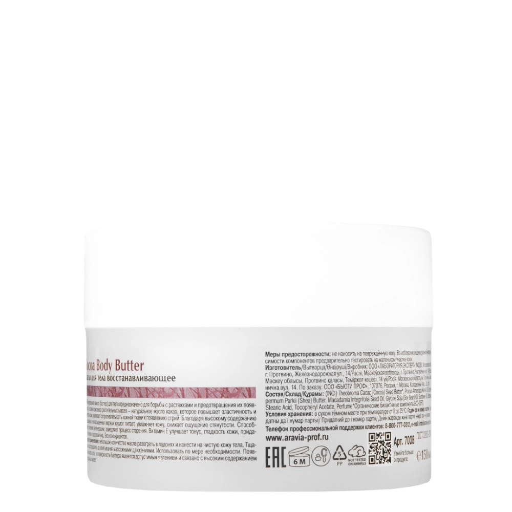 100% натуральное масло (баттер) для тела, без консервантов. В основе комплекса растительных масел — натуральное масло какао, которое повышает эластичность и упругость кожи, усиливает сопротивляемость кожной ткани к появлению стрий. Благодаря высокому содержанию насыщенных и ненасыщенных жирных кислот питает, увлажняет кожу, снижает ощущение стянутости. Способствует усилению регенерации, замедляет процесс старения. Комплекс масел миндаля, ши, ореха макадамии и витамина Е улучшает тонус, гладкость кожи, придаёт ей сияние и здоровый вид.