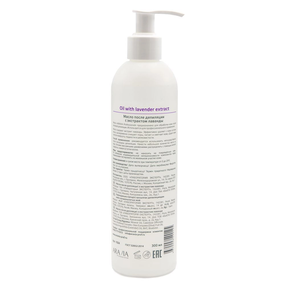 Масло предназначено для обработки кожи после восковой депиляции. Содержит экстракт лаванды. Эффективно удаляет с кожи остатки воска, одновременно очищает поры, питает и смягчает кожу. Дарит коже чувство комфорта, гладкости и шелковистости.