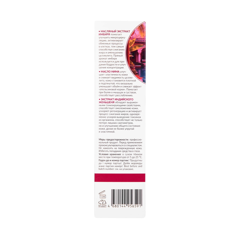 • Экстракт индийского женьшеня обладает выраженными тонизирующими свойствами, способствует омоложению кожи, ускоряет регенерацию и активирует процесс сжигания жиров, одновременно способствуя выведению токсинов из организма, способствует не только потере лишних сантиметров, но и улучшению общего состояния кожи, делая ее более упругой и эластичной.
