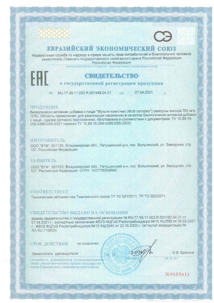 Состав продукта: магния цитрат; капсула (желатин пищевой); кальция карбонат; носитель: микрокристаллическая целлюлоза; кальция цитрат, аскорбиновая кислота (витамин С), цинка цитрат, DL-альфа-токоферола ацетат (витамин Е), никотинамид (витамин РР/В3), натрия тетраборат, марганца глюконат, бета-каротин, кальция пантотенат (витамин В5); агент антислёживающий: диоксид кремния аморфный; агент антислёживающий: магниевая соль стеариновой кислоты; менахинон (витамин К2), меди цитрат, фитоменадион (витамин К1), холекальциферол (витамин D3), пиридоксина гидрохлорид (витамин В6), ретинола ацетат (витамин А), тиамина гидрохлорид (витамин В1), рибофлавин (витамин В2), L-метилфолат кальция (фолиевая кислота/витамин В9), хрома пиколинат, калия йодат, молибдат натрия, селенит натрия, биотин (витамин В7/Н), метилкобаламин (витамин В12).