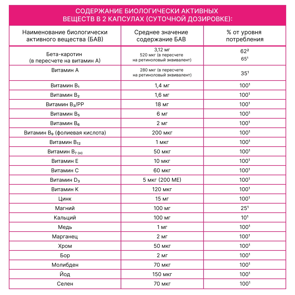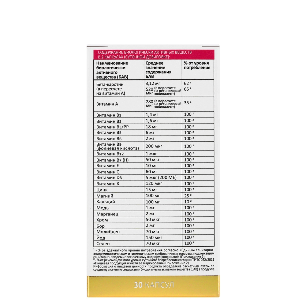 Рекомендации для использования: рекомендуется в качестве биологически активной добавки к пище — источника бета-каротина, дополнительного источника витаминов (А, Е, С, К, В1, В2, В3(РР), В5, В6, В7(Н), В9, В12, D3 (в 1 капсуле — 100 МЕ)), минеральных веществ (магния, цинка, марганца, меди, хрома, селена, йода, бора, молибдена), содержащей кальций.