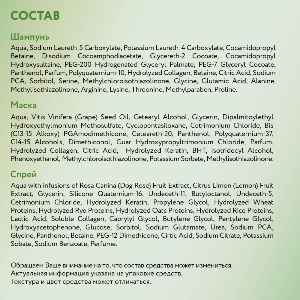 Состав продукта (INCI): Aqua With Infusions Of Rosa Canina (Dog Rose) Fruit Extract, Citrus Limon (Lemon) Fruit Extract, Glycerin, Silicone Quaternium-16, Undeceth-11, Butyloctanol, Undeceth-5, Cetrimonium Chloride, Hydrolyzed Keratin, Propylene Glycol, Hydrolyzed Wheat Proteins, Hydrolyzed Rye Proteins, Hydrolyzed Oats Proteins, Hydrolyzed Rice Proteins, Lactic Acid, Soluble Collagen, Caprylyl Glycol, Butylene Glycol, Pentylene Glycol, Hydroxyacetophenone, Glucose, Sorbitol, Sodium Glutamate, Urea, Sodium Pca, Glycine, Panthenol, Betaine, Peg-12 Dimethicone, Cirtic Acid, Sodium Citrate, Potassium Sobate, Sodium Benzoate, Perfume.