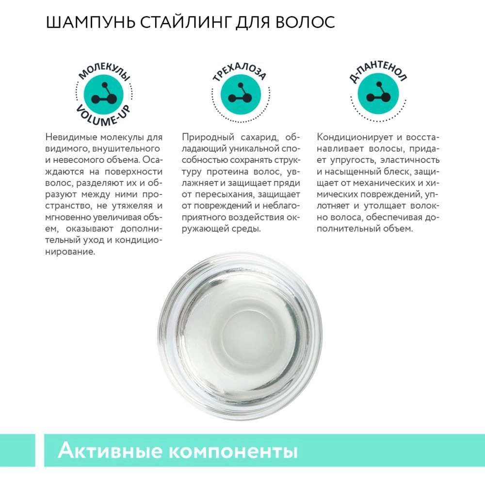 Особая формула шампуня с легкой гелевой текстурой разработана специально для создания непревзойденного эффекта двойного объема и повышения качества укладки. При соединении с водой и образовании воздушной пены молекулы Volume-up осаждаются на волосах невесомой вуалью, оказывая кондиционирующее действие и придавая гладкость и блеск, а при последующем высыхании меняют свою структуру, увеличиваясь в размерах и создавая пространство между волосками, чем обеспечивают прическе исключительный объем и густоту без утяжеления. Трегалоза и Д-пантенол обладают мощными увлажняющими и влагоудерживающими свойствами, улучшают расчесывание, повышают эластичность и упругость, облегчая процесс укладки, а также защищая волосы от повреждений и негативного влияния внешних факторов.