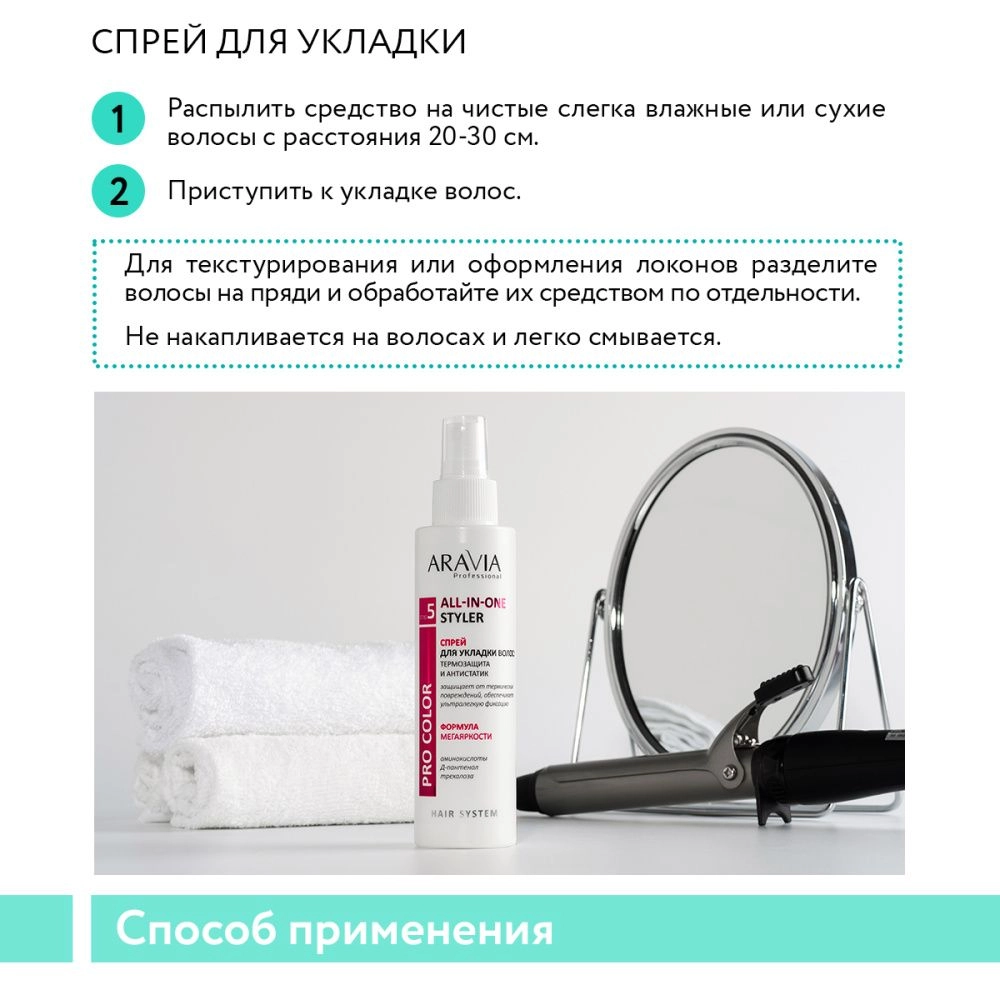 Распылить средство на чистые слегка влажные или сухие волосы с расстояния 20-30 см, затем приступить к укладке волос. Для текстурирования или оформления локонов разделите волосы на пряди и обработайте их средством по отдельности. Не накапливается на волосах и легко смывается.