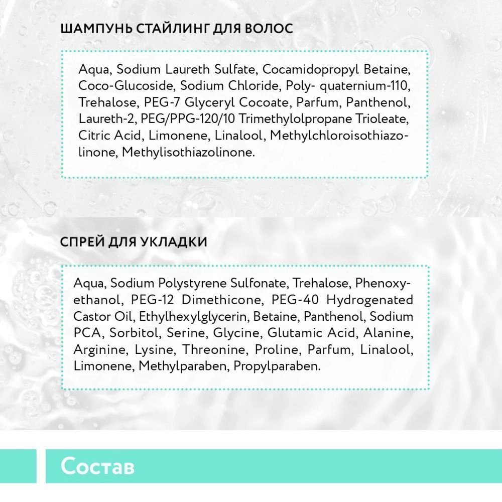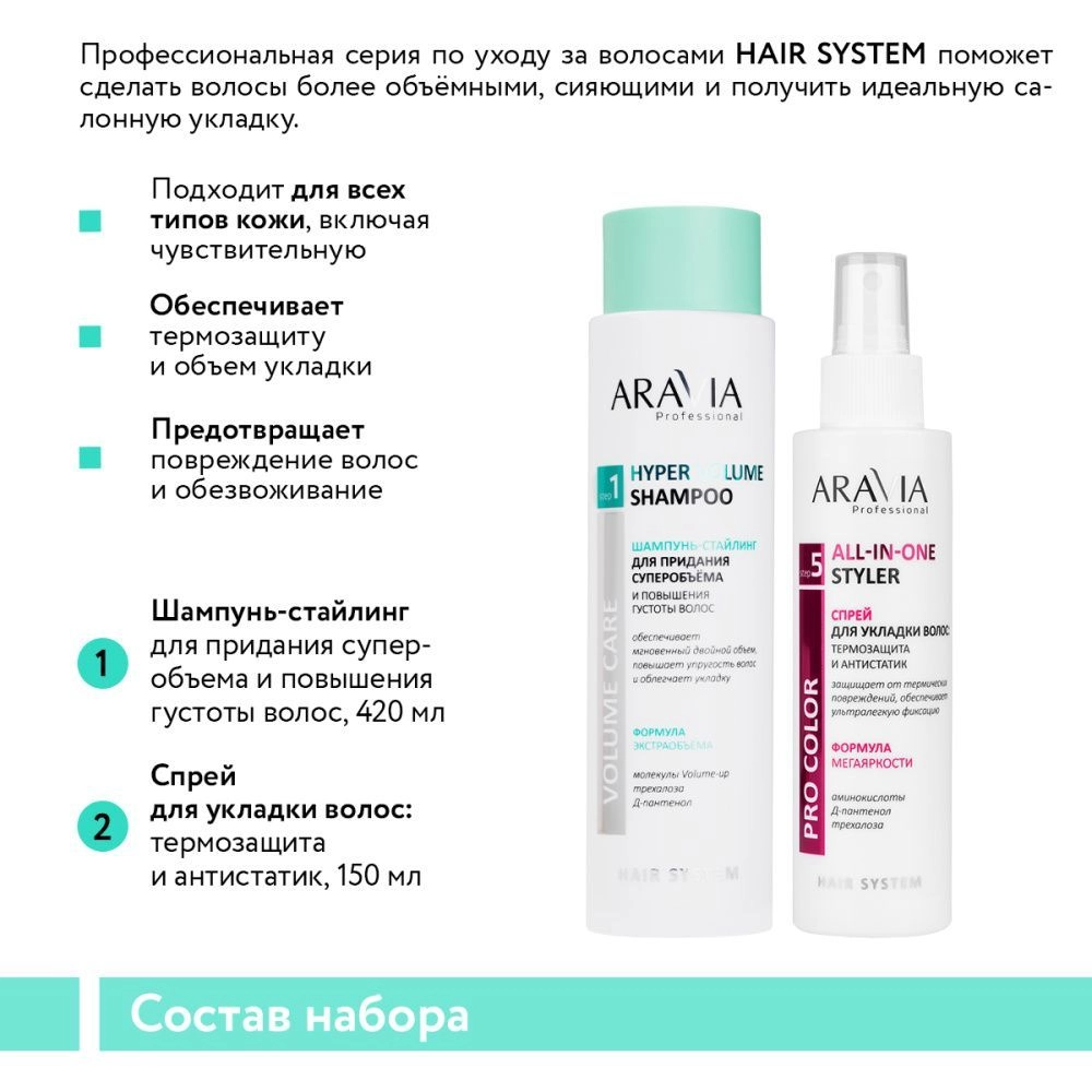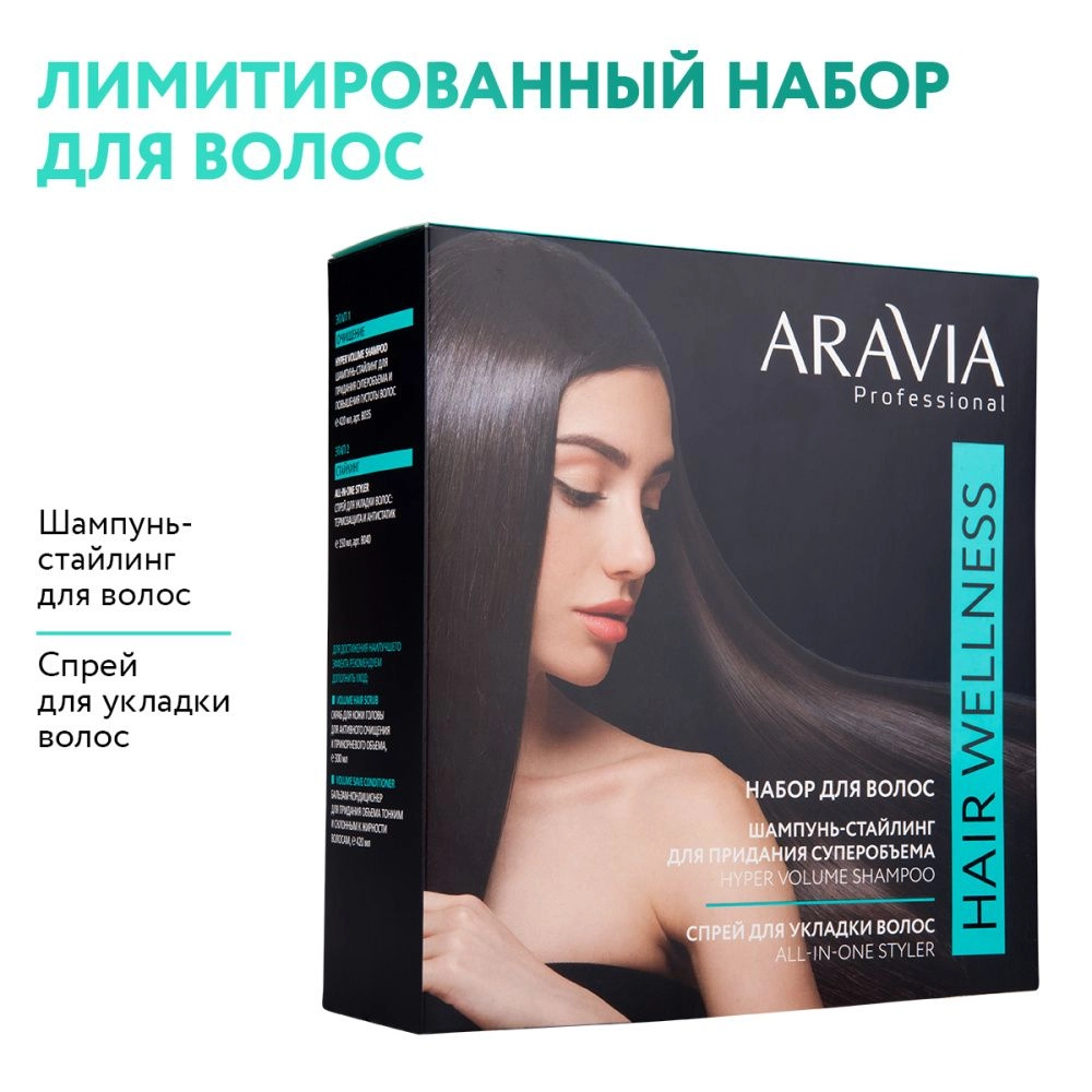 В состав набора входят: Шампунь-стайлинг для придания суперобъема и повышения густоты волос, 420 мл (артикул В035). П