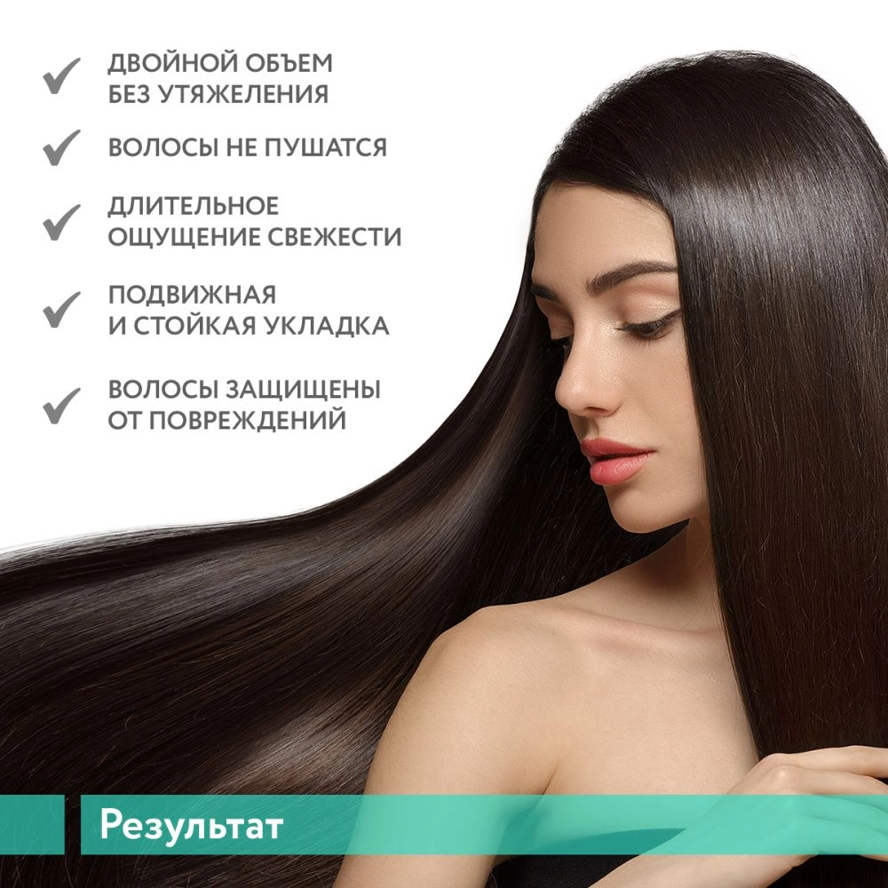 Улучшает расчесывания, Увеличивает объем волос, Оказывает термозащитное действие, Уменьшает пушистость