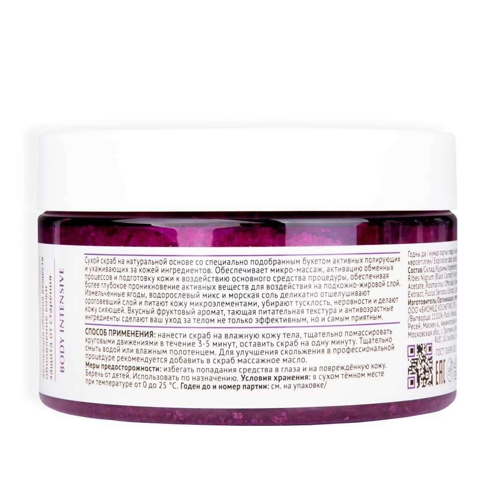Сухой скраб на натуральной основе со специально подобранным букетом активных полирующих и ухаживающих за кожей ингредиентов. Обеспечивает микро-массаж, активацию обменных процессов и подготовку кожи к воздействию основного средства процедуры, обеспечивая более глубокое проникновение активных веществ для воздействия на подкожно-жировой слой. Измельченные ягоды, водорослевый микс и морская соль деликатно отшелушивают ороговевший слой и питают кожу микроэлементами, убирают тусклость, неровности и делают кожу сияющей. Вкусный фруктовый аромат, тающая питательная текстура и антивозрастные ингредиенты сделают ваш уход за телом не только эффективным, но и приятным.
