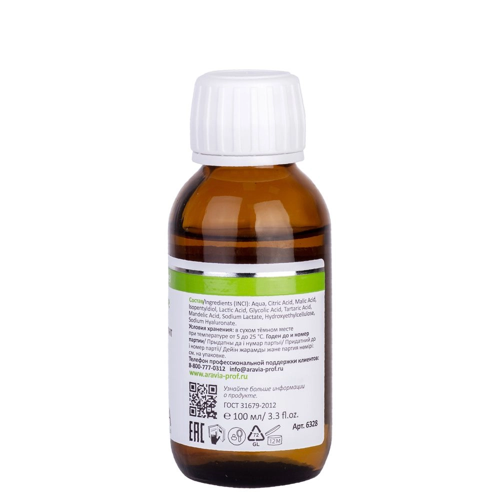 Состав продукта (INCI): Aqua, Citric Acid, Malic Acid, Isopentyldiol, Lactic Acid, Glycolic Acid, Tartaric acid, Mandelic Acid, Sodium Lactate, Hydroxyethylcellulose, Sodium Hyaluronate.