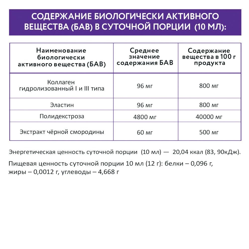 Содержание биологически активного вещества в 100 г продукта: Коллаген гидролизованный I (96 мг) и III типа (800 мг)