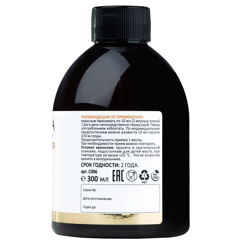 РЕКОМЕНДАЦИИ ПО ПРИМЕНЕНИЮ:  взрослым принимать по 10 мл (2 мерные ложки) 1 раз в день непосредственно перед едой. Перед употреблением взболтать. По индивидуальным предпочтениям можно развести 10 мл сиропа в 50 мл воды.