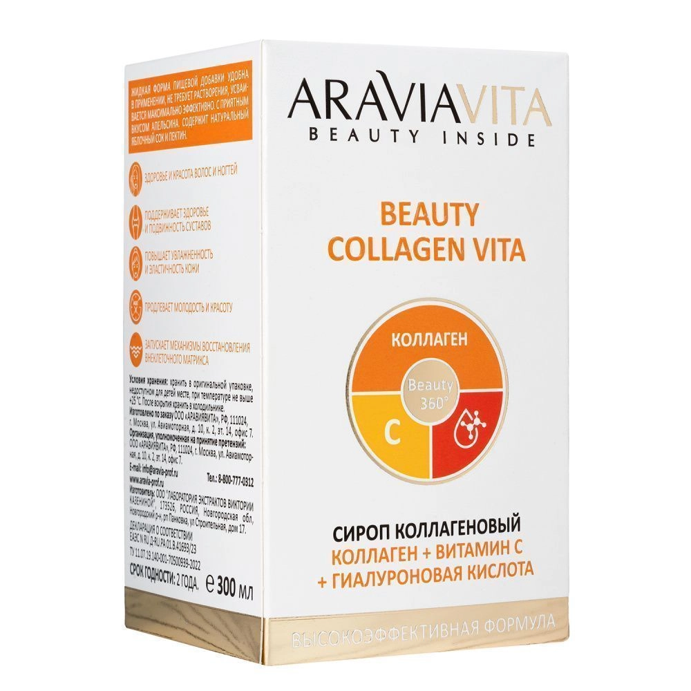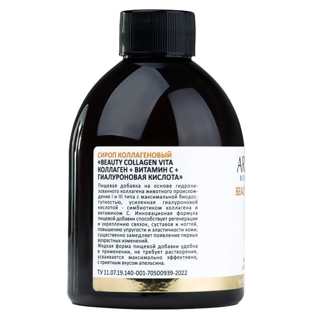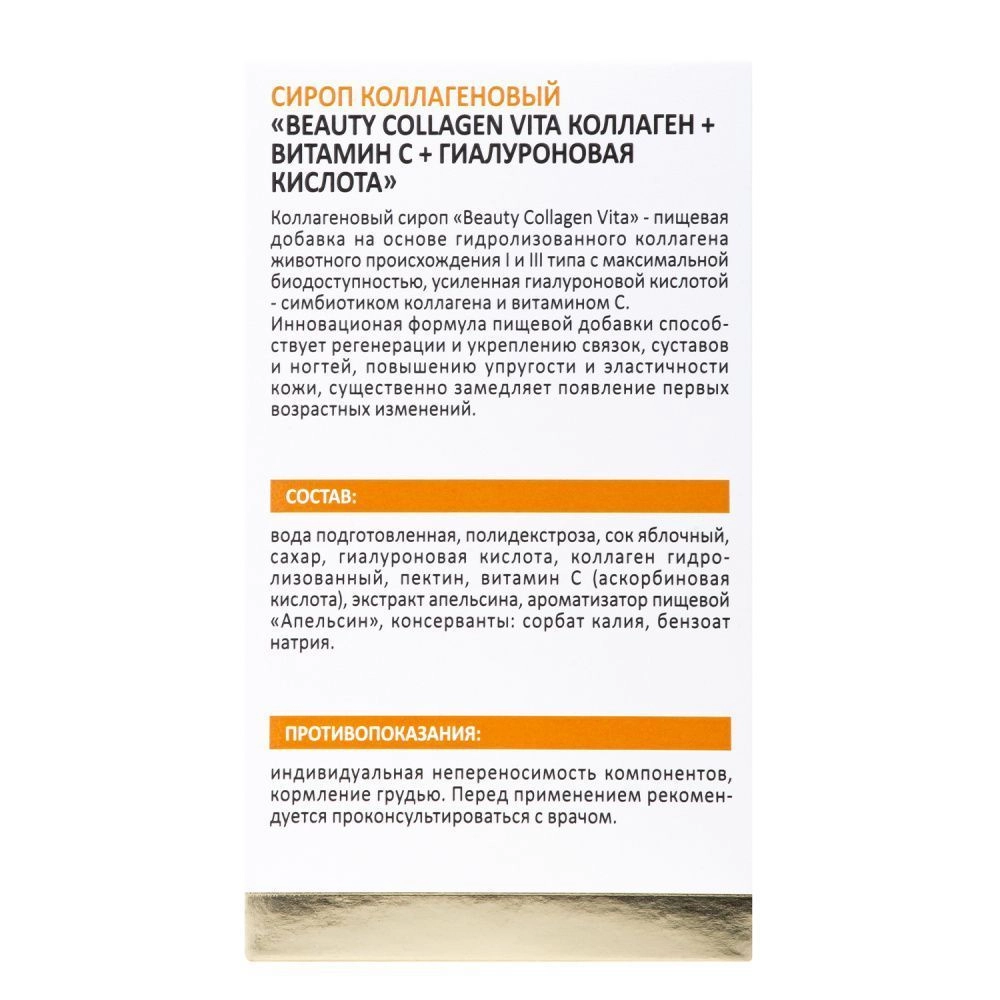 Коллагеновый сироп «Beauty Collagen Vita» - пищевая добавка на основе гидролизованного коллагена животного происхождения I и III типа с максимальной биодоступностью, усиленная гиалуроновой кислотой-симбиотиком коллагена и витамином С. Инновационая формула пищевой добавки способствует регенерации и укреплению связок, суставов и ногтей, повышению упругости и эластичности кожи, существенно замедляет появление первых возрастных изменений. Жидкая форма пищевой добавки удобна в применении, не требует растворения, усваивается максимально эффективно, с приятным вкусом апельсина.