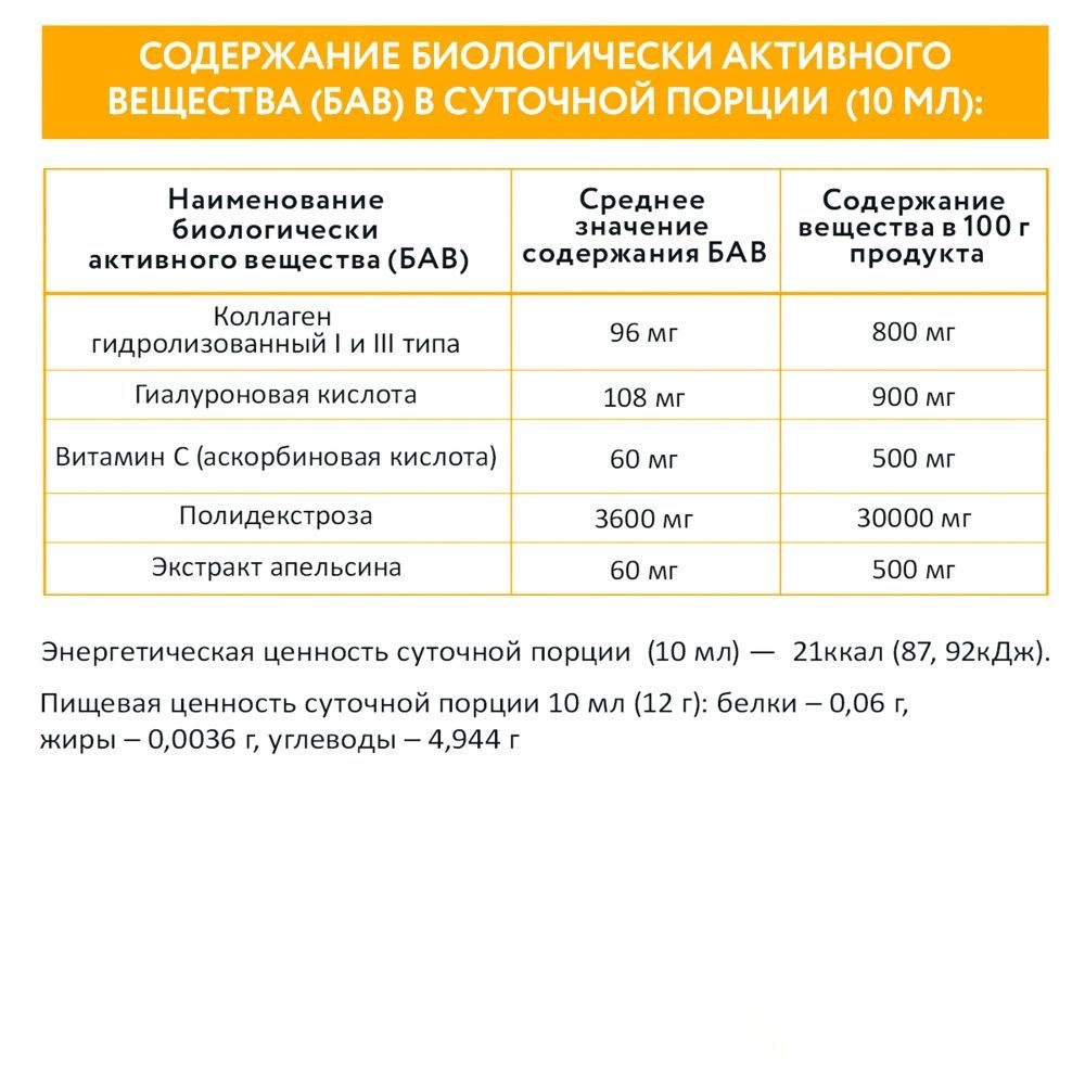 Состав продукта: вода подготовленная, полидекстроза, сок яблочный, сахар, гиалуроновая кислота, коллаген гидролизованный, пектин, витамин С (аскорбиновая кислота), экстракт апельсина, ароматизатор пищевой «Апельсин», консерванты: сорбат калия, бензоат натрия.