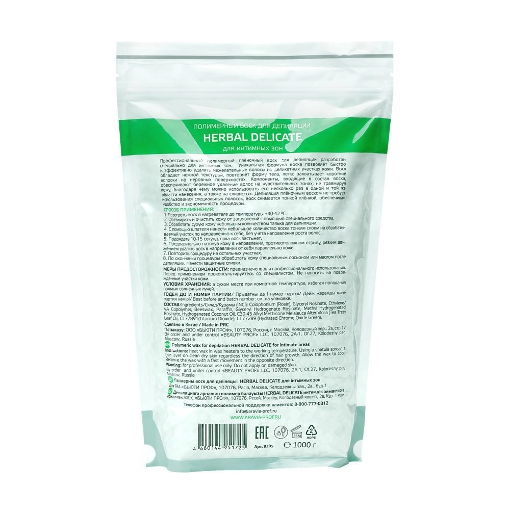 Профессиональный полимерный плёночный воск для депиляции разработан специально для интимных и деликатных зон. Уникальная формула воска позволяет быстро и эффективно удалить нежелательные волосы на деликатных участках кожи. Воск обладает нежной текстурой, повторяет форму тела, легко захватывает короткие волоски на неровных поверхностях. Компоненты, входящие в состав воска, обеспечивают бережное удаление волос в чувствительных зонах, не травмируя кожу, благодаря чему можно использовать его несколько раз в одной и той же области нанесения, а также на слизистых.