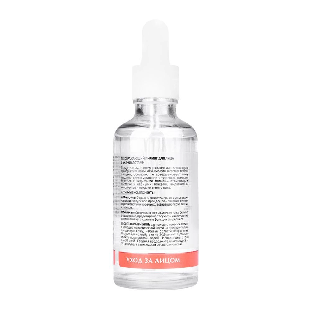 Пилинг для лица предназначен для мгновенного преображения кожи. АНА-кислоты в составе глубоко очищают, обновляют и совершенствуют кожу, устраняют следы усталости и тусклость, помогают бороться с видимыми пятнами пигментации, постакне и черными точками, выравнивают микрорельеф и придают сияние коже. pH 3.5-4.0.