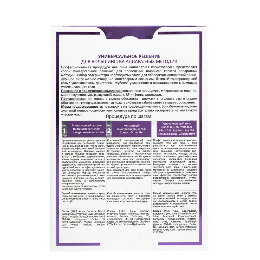 Профессиональная процедура для лица «Аппаратная косметология» представляет собой универсальное решение для проведения широкого спектра аппаратных методик. Набор содержит три необходимых этапа для проведения аппаратных процедур по лицу и повышение их эффективности.