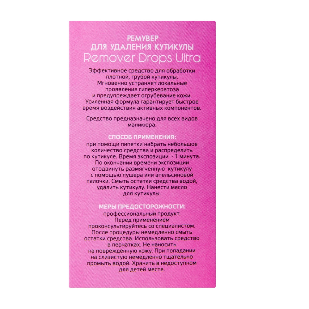 Эффективное средство для обработки плотной, грубой кутикулы. Мгновенно устраняет локальные проявления гиперкератоза и предупреждает огрубевание кожи. Усиленная формула гарантирует быстрое время воздействия активных компонентов. Косметическое средство предназначено для всех видов маникюра.