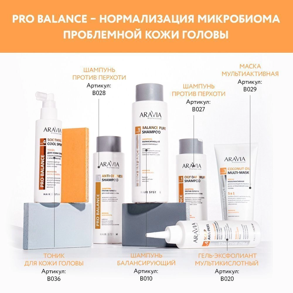 1. Шампунь против перхоти для жирной кожи головы Oily Dandruff Shampoo, ARAVIA Professional, артикул: В028, применяйте по мере загрязнения кожи головы.