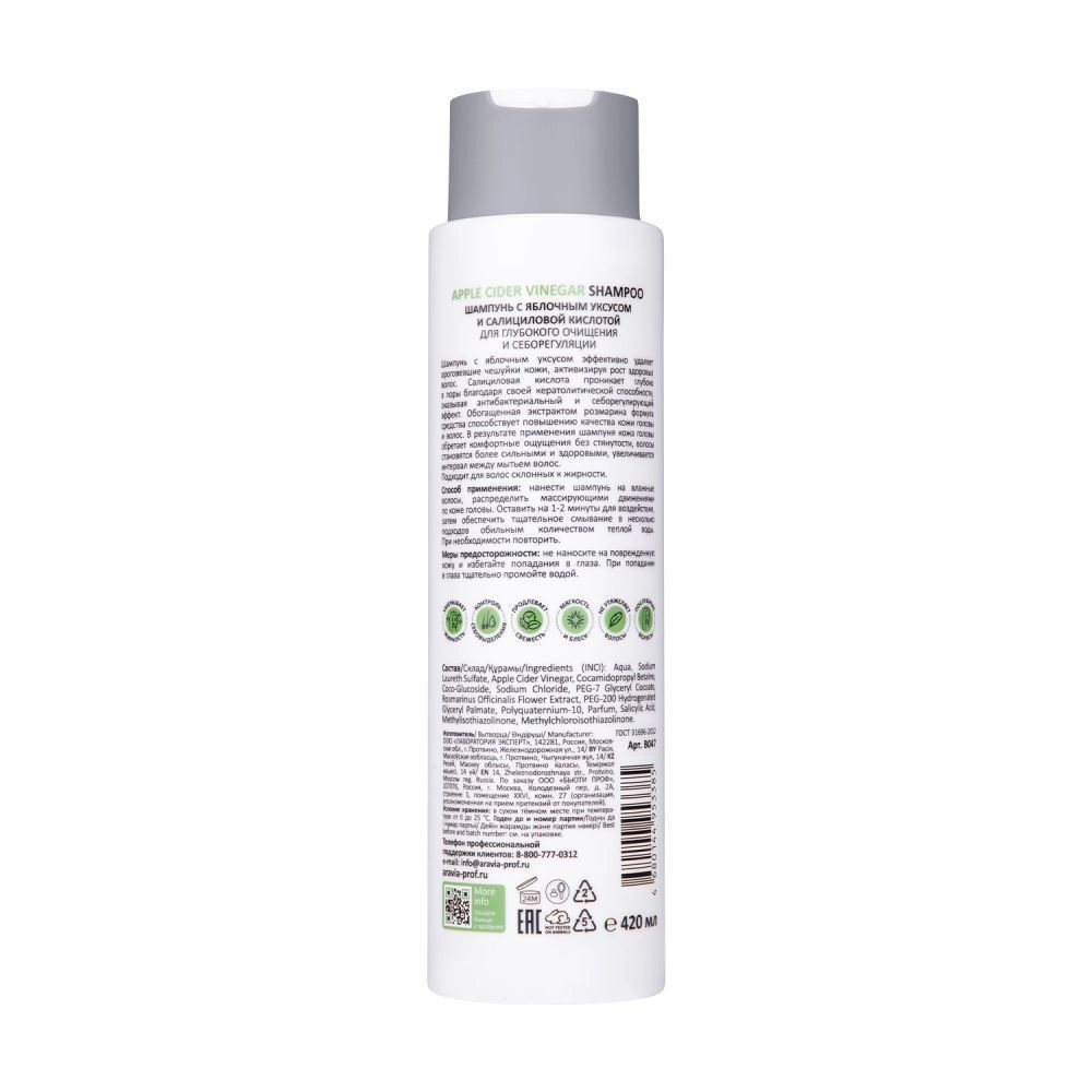 Шампунь с яблочным уксусом эффективно удаляет ороговевшие чешуйки кожи, активизируя рост здоровых волос. Салициловая кислота проникает глубоко в поры благодаря своей кератолитической способности, оказывая антибактериальный и себорегулирующий эффект. Обогащенная экстрактом розмарина формула средства способствует повышению качества кожи головы и волос. В результате применения шампуня кожа головы обретает комфортные ощущения, без стянутости, волосы становятся более сильными и здоровыми, увеличивается интервал между мытьем волос.