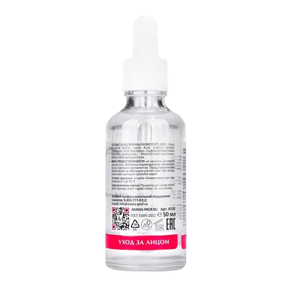 Состав продукта (INCI): Aqua, Butylene Glycol, Lactic Acid, Sodium Lactate, Lactobionic Acid, Panthenol, Hydroxyethylcellulose, Sodium Hydroxide, Methylisothiazolinone, Methylchloroisothiazolinone.
