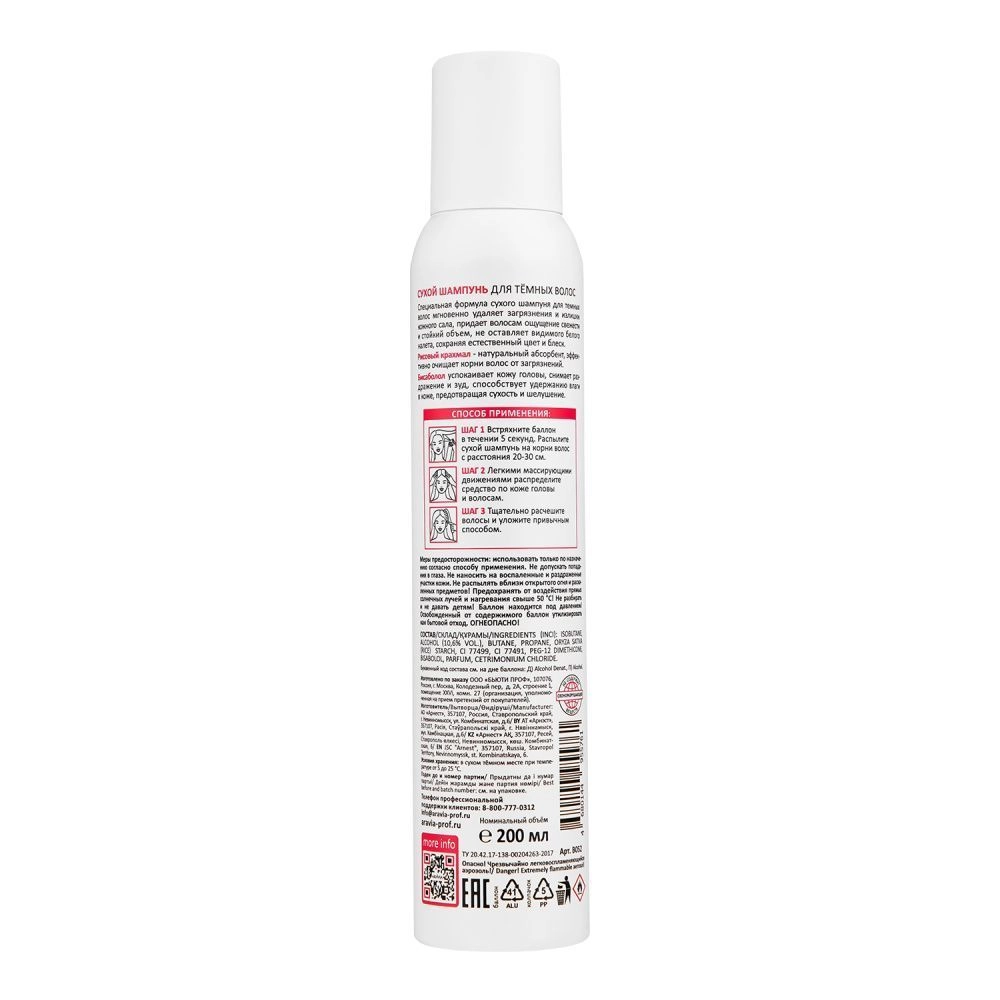 Специальная формула сухого шампуня для тёмных волос мгновенно удаляет загрязнения и излишки кожного сала, не оставляет видимого белого налета, сохраняя естественный цвет и блеск. Она обеспечивает мгновенное освежение и придание волосам объема без использования воды, а благодаря компактной упаковке, сухой шампунь удобно взять с собой.