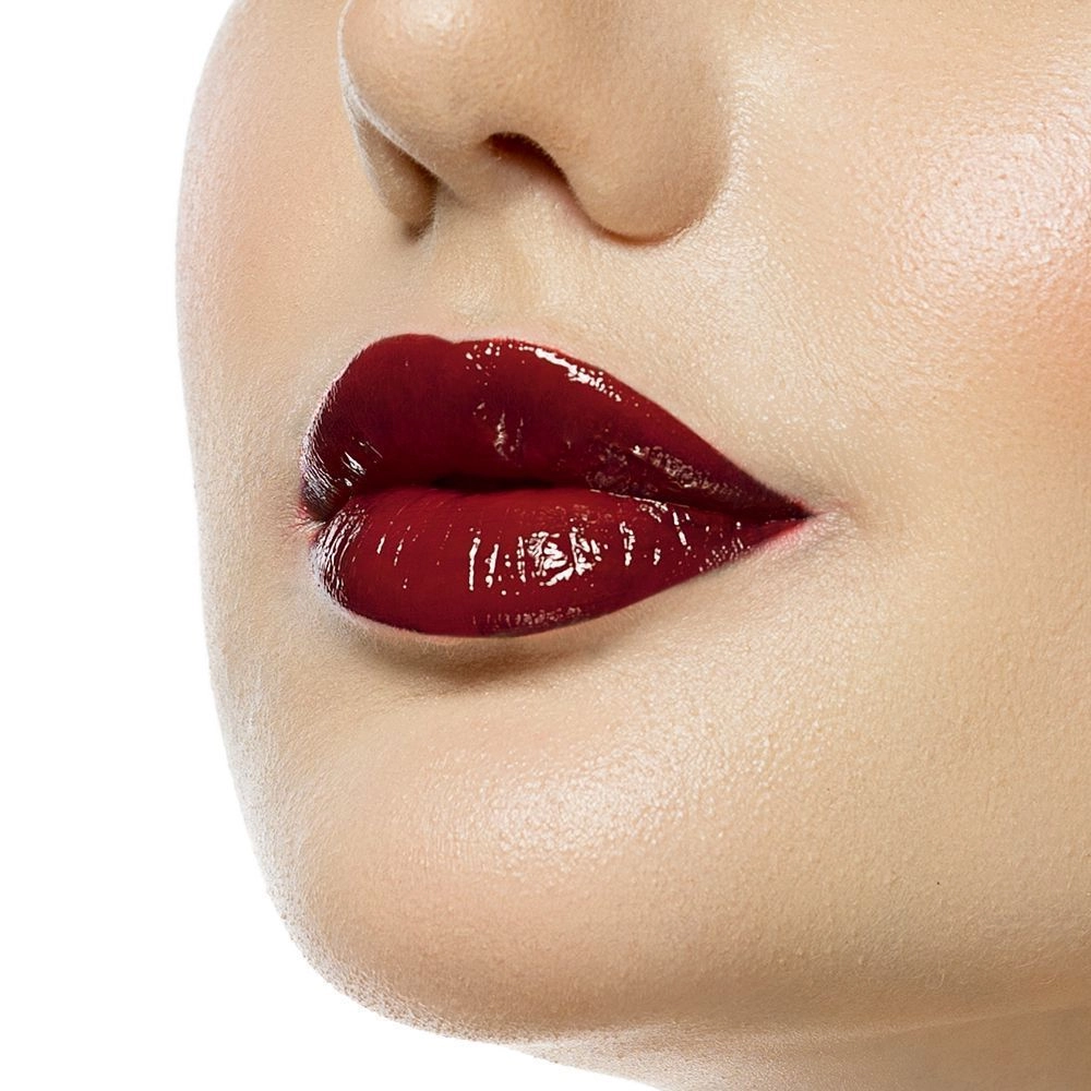 При нанесении густым слоем обеспечивает яркий и выразительный эффект насыщенной лаковой помады с зеркальным блеском.